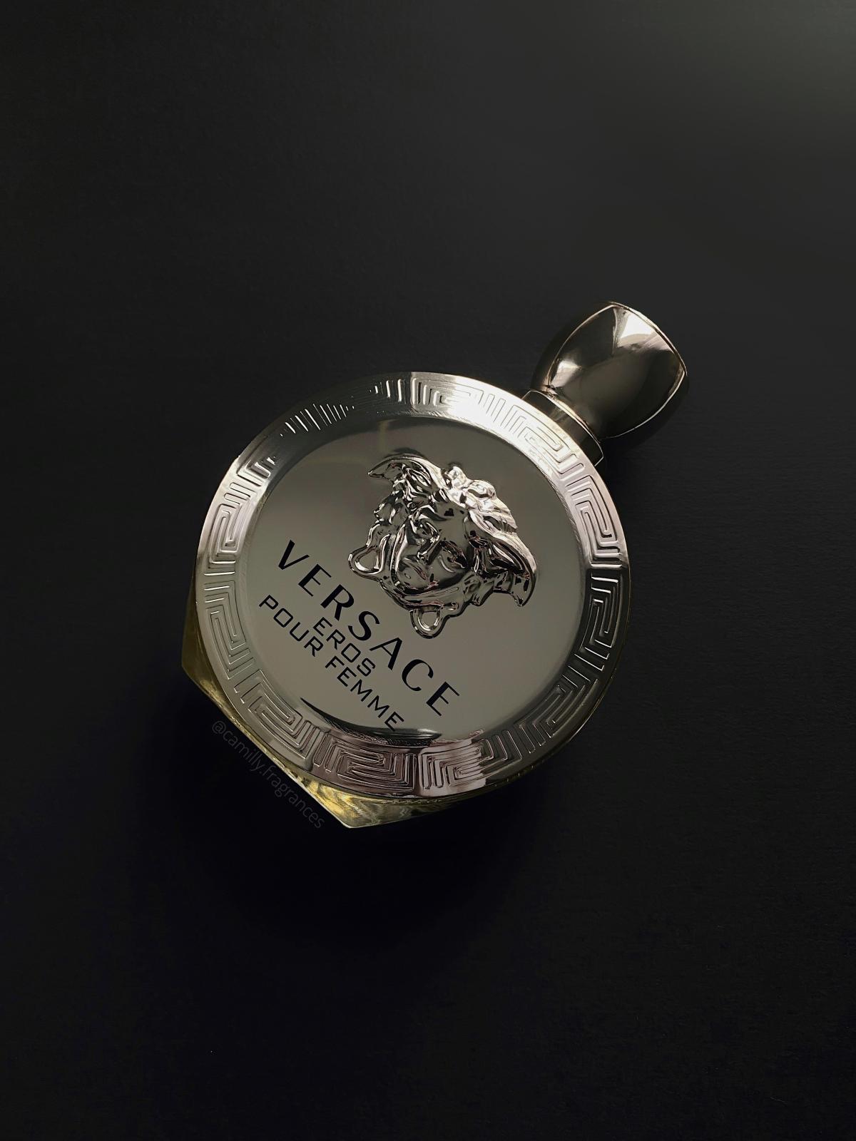 Versace při tvorbě ženské verze modelu Eros nešetřil. Pánská verze se stala absolutním hitem po celém světě, a přestože je velmi komerční, je to skvělý parfém. Trojice oceněných velikánů se spojila, aby vytvořila verzi, která by se bez ostychu mohla jmenovat Aphrodite. Vůni vytvořili Alberto Morillas, Olivier Cresp a Nathalie Lorson. Eros pour femme nemá být silnou, afrodiziakální vůní, naopak, je ženská a ctnostná. S velmi výraznými citrusovými a zelenými tóny, téměř absolutním jasmínem a nádherným dřevitým pozadím s kafrovým nádechem ambroxamu. Nóta granátového jablka zanechává velmi kyselou sladkost, která sdílí prostor s citronovým květem a citrusovými tóny. Poté přichází jasmín, který je silný a opojný a dobře se snoubí s téměř kafrovými tóny, které následují, dokud dřevitá nóta nezanechá svůj závěrečný dotek. Velkým vrcholem v této kompozici je pižmo, které nabývá na těle v srdcových tónech a činí kompozici harmonickou a svůdnou. Žena Eros je bezpochyby ženskou a dobyvačnou Afroditou.
