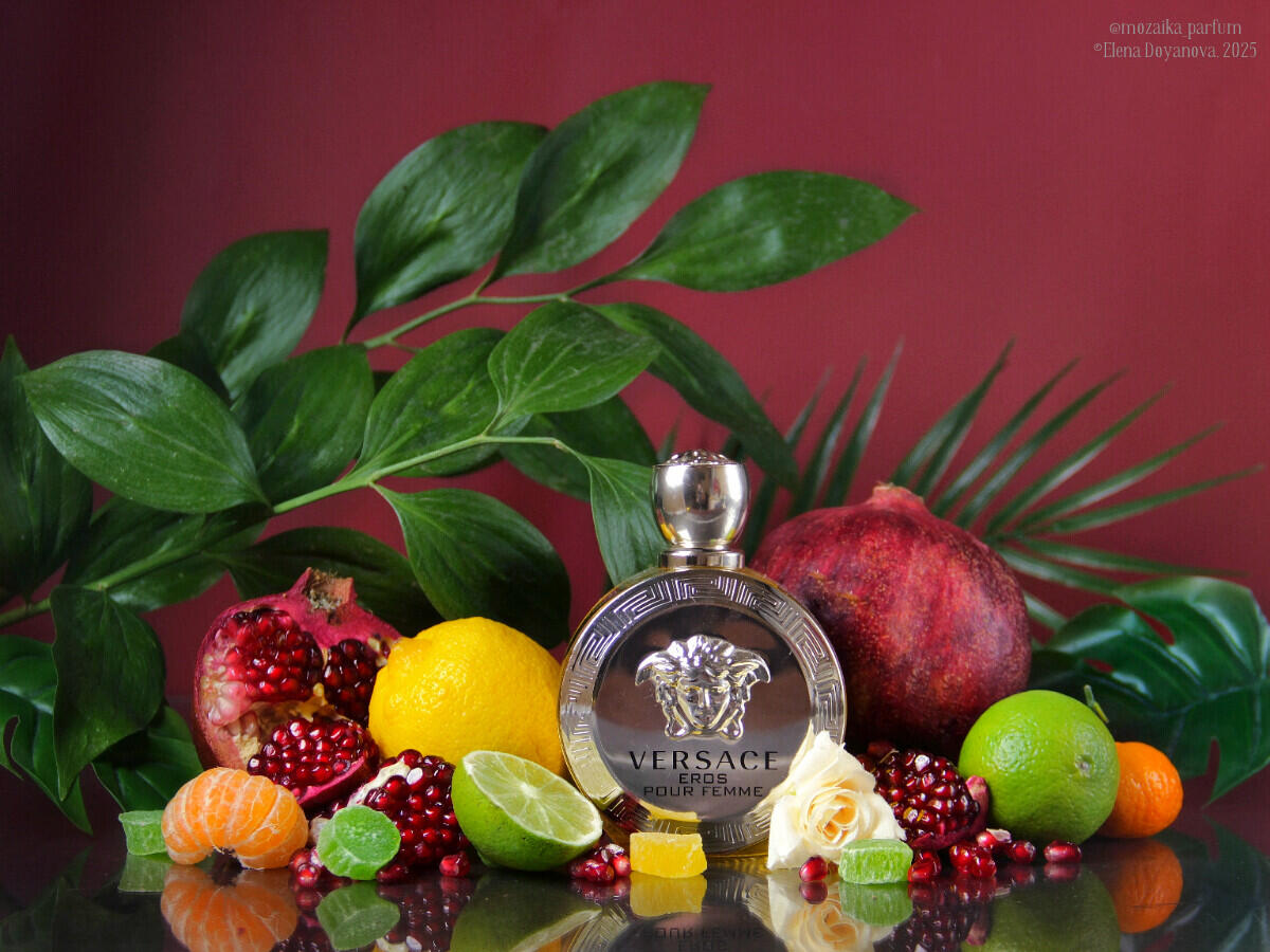 Eros pour femme byl postaven na citrusových, květinových tónech s ovocným nádechem granátového jablka. Je jen málo parfémů, jejichž vzhled je v podstatě postaven na zdůraznění citrusových tónů, nevoní jako většina parfémů této citrusové řady, ale jako většina parfémů Versace má středomořský nádech, upřímně řečeno, když jsem si ho kupovala, myslela jsem si, že to bude parfém ve stylu bomby kvůli flakonu, ale mýlila jsem se, je velmi odlišný a myslím, že se dá nosit kdykoli v chladných dnech, i když cítím hodně citronového květu a je to trochu jako euphoria edp, nenechává nic náhodě, jeho fixace a projekce jsou dobré, vydechuje v prvních hodinách a fixuje se asi 8 hodin..