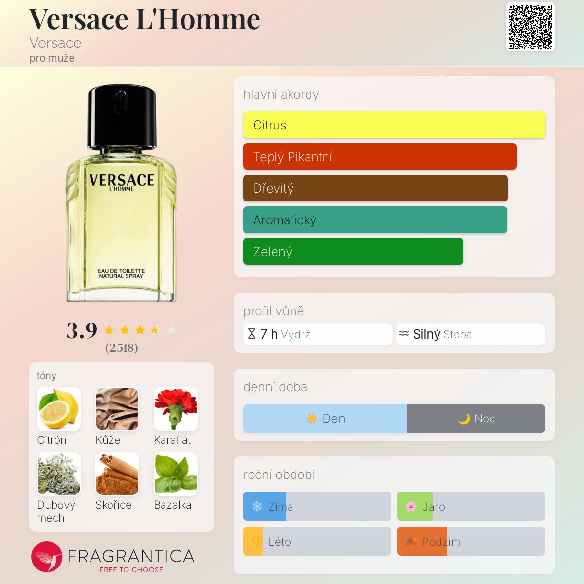 Versace L'Homme podle Versace je Woody Chypre vůně pro muže. Versace L'Homme byl/a uveden/a v roce 1984. "Nosem" za touto vůní je Roger Pellegrino. Vrchní tóny jsou Citrón, Bazalka, Bergamot, Petitgrain a Zelené tóny; střední tóny jsouKarafiát, Skořice, Pačuli, Santalové dřevo, Růže, Cedr a Jasmín ; základní tóny jsou Kůže, Dubový mech, Pižmo, Vanilka, Labdanum, Jantar (ambra) a Fazole tonka.