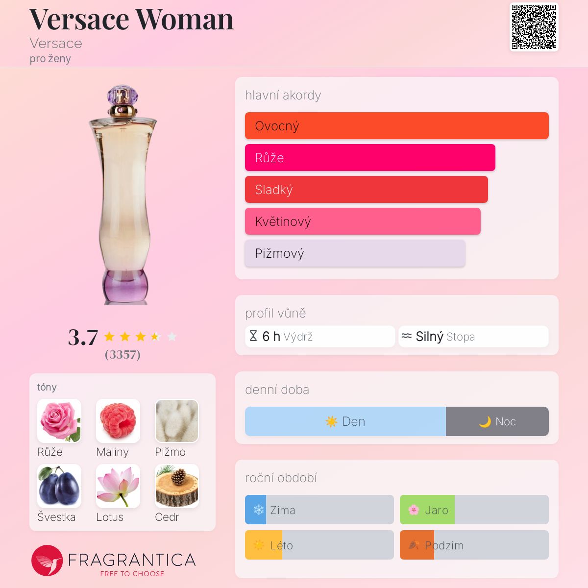Versace Woman podle Versace je Floral Woody Musk vůně pro ženy. Versace Woman byl/a uveden/a v roce 2000. "Nosem" za touto vůní je Christine Nagel. Vrchní tóny jsou Růže, Jasmínový list a Bergamot; střední tóny jsouMaliny, Švestka, Lotus a Cedr ; základní tóny jsou Pižmo a Jantar (ambra).