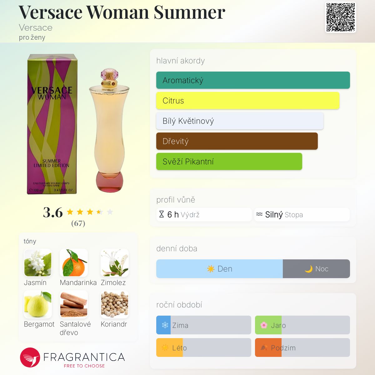 Versace Woman Summer podle Versace je Floral Green vůně pro ženy. Versace Woman Summer byl/a uveden/a v roce 2002. Vrchní tóny jsou Jasmín, Mandarinka, Zimolez, Bergamot a Citron amalfi; střední tóny jsouKoriandr, Bazalka a Rozmarýn ; základní tóny jsou Santalové dřevo, Vetiver a Dubový mech.