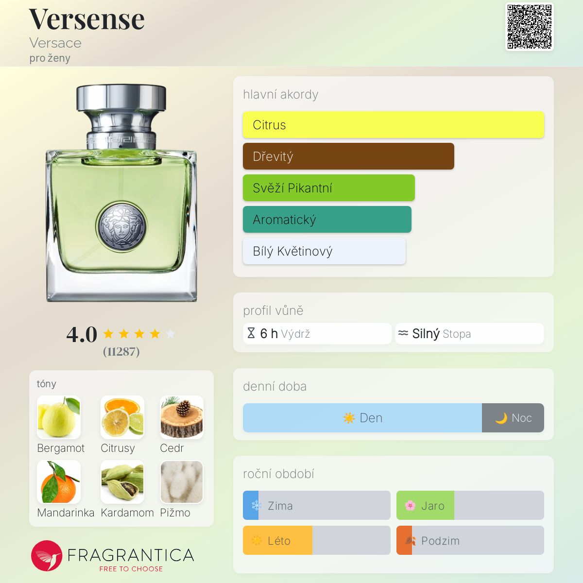 Versense podle Versace je Woody Floral Musk vůně pro ženy. Versense byl/a uveden/a v roce 2009. Vrchní tóny jsou Bergamot, Citrusy, Zelená mandarinka, Fík a Hruška; střední tóny jsouKardamom, Lilie, Jasmín a Narcis ; základní tóny jsou Virginský cedr, Pižmo, Olivovník a Santalové dřevo.