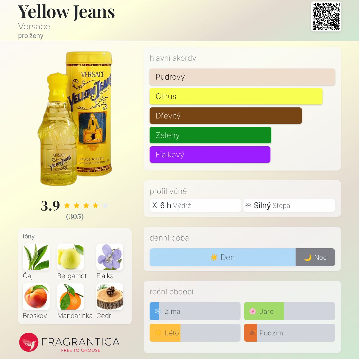 Yellow Jeans podle Versace je Floral Green vůně pro ženy. Yellow Jeans byl/a uveden/a v roce 1996. "Nosem" za touto vůní je Nathalie Feisthauer. Vrchní tóny jsou Bergamot, Fialka, Broskev a Mandarinka; střední tóny jsouČaj, Otočník a Růže ; základní tóny jsou Cedr, Santalové dřevo, Pižmo a Vanilka.
