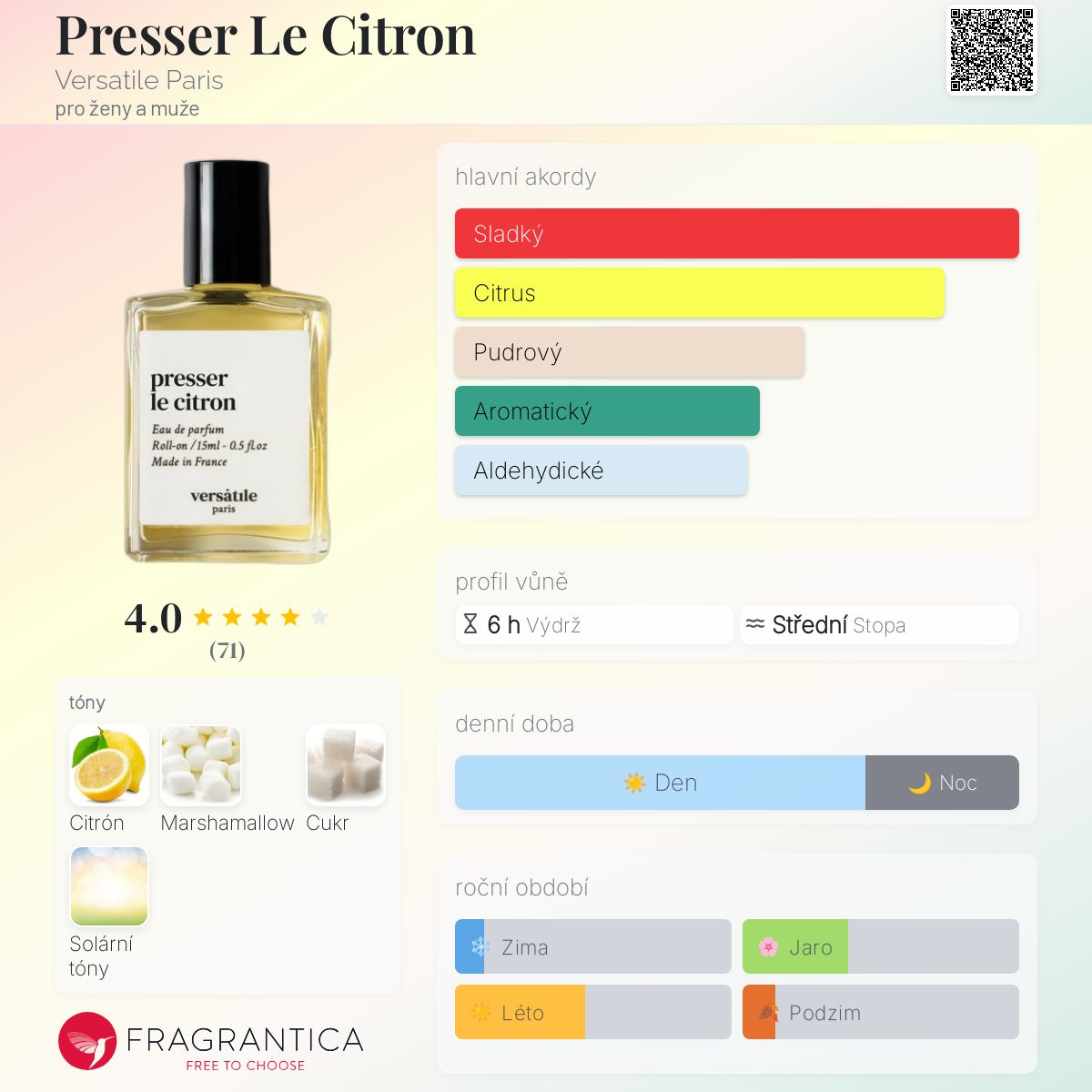 Presser Le Citron podle Versatile Paris je vůně pro ženy a muže. Toto je nová vůně. Presser Le Citron byl/a uveden/a v roce 2025. Presser Le Citron byl/a vytvořen/a Anne-Sophie Behaghel a Pauline Jegousse. Vrchní tón je Citrón ; střední tóny jsouMarshmallow a Solární tóny ; základní tón je Cukr.