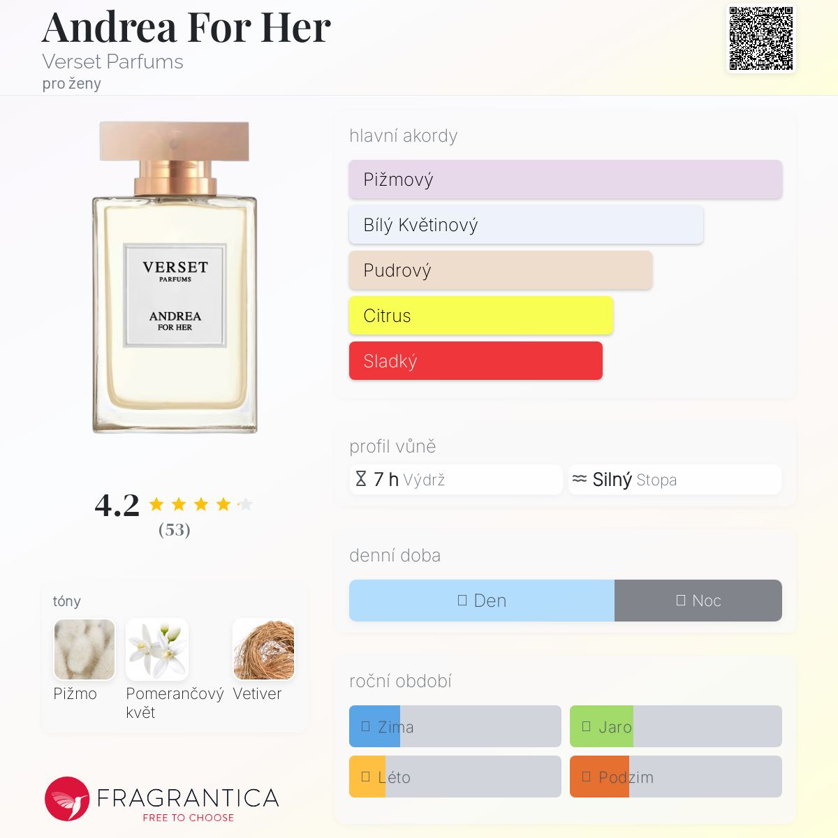 Andrea For Her podle Verset Parfums je Floral vůně pro ženy. Vrchní tón je Pomerančový květ ; střední tón jePižmo ; základní tón je Vetiver.