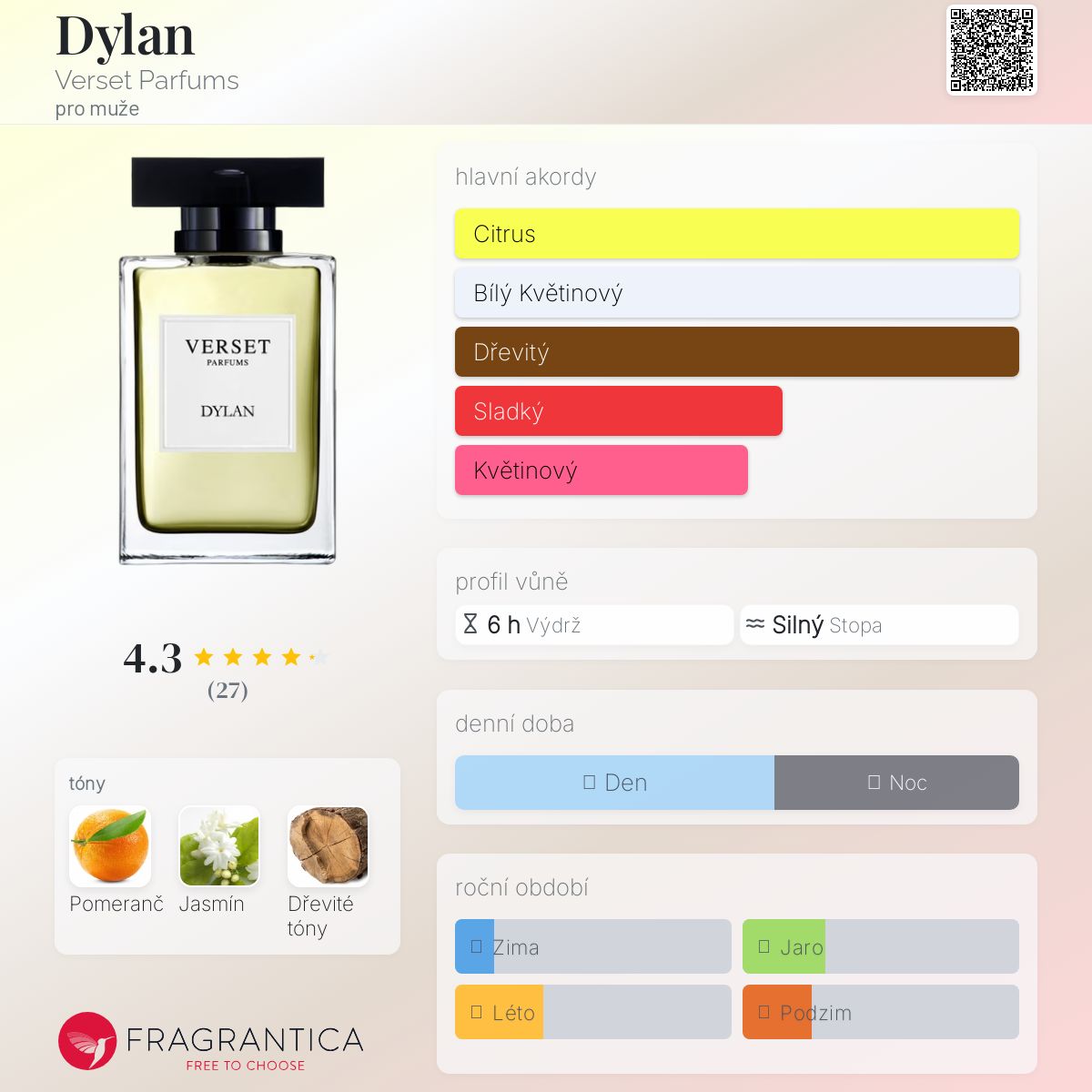 Dylan podle Verset Parfums je Woody Aromatic vůně pro muže. Vrchní tón je Pomeranč ; střední tón jeJasmín ; základní tón je Dřevité tóny.