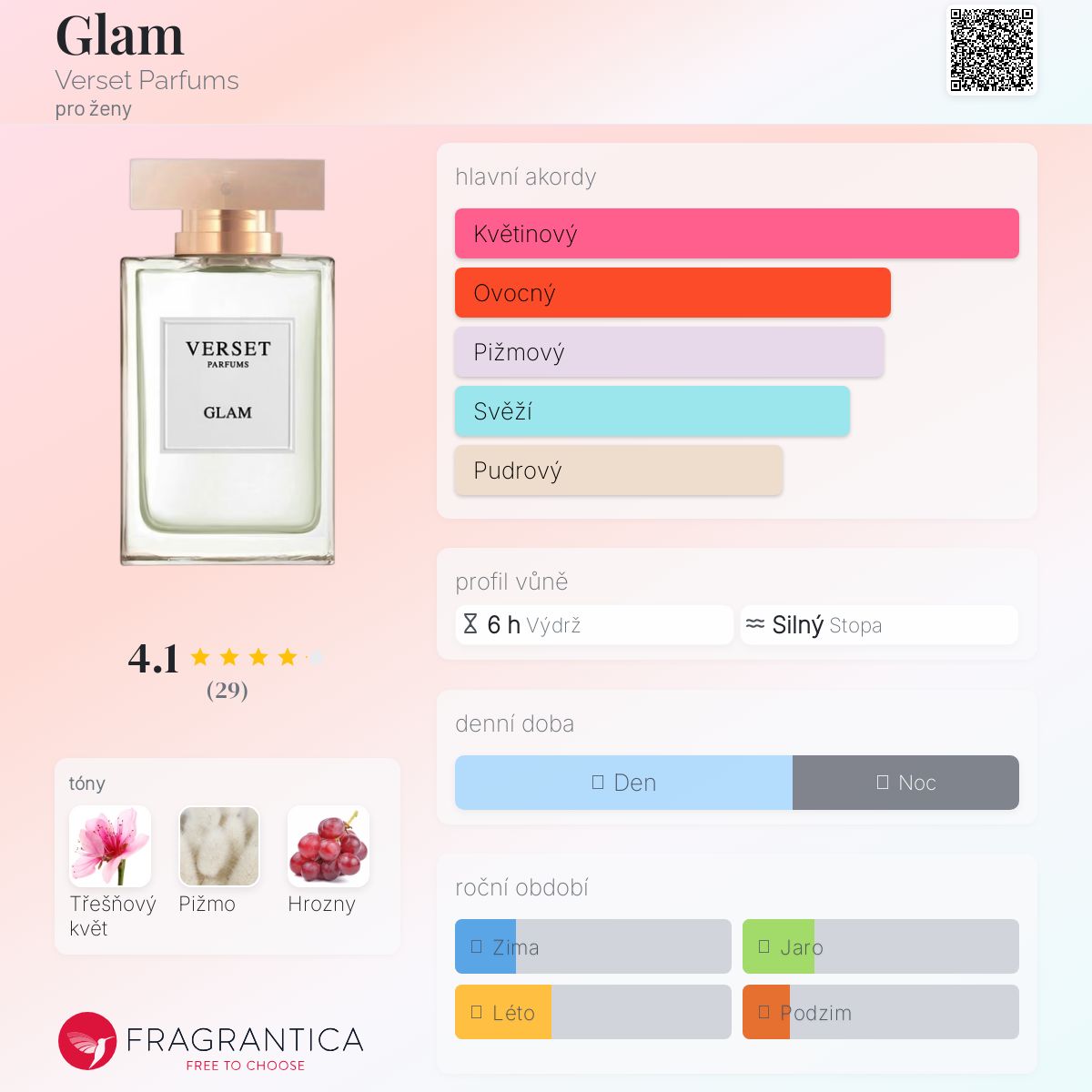 Glam podle Verset Parfums je Floral Fruity vůně pro ženy. Vrchní tón je Hrozny ; střední tón jeTřešňový květ ; základní tón je Pižmo.