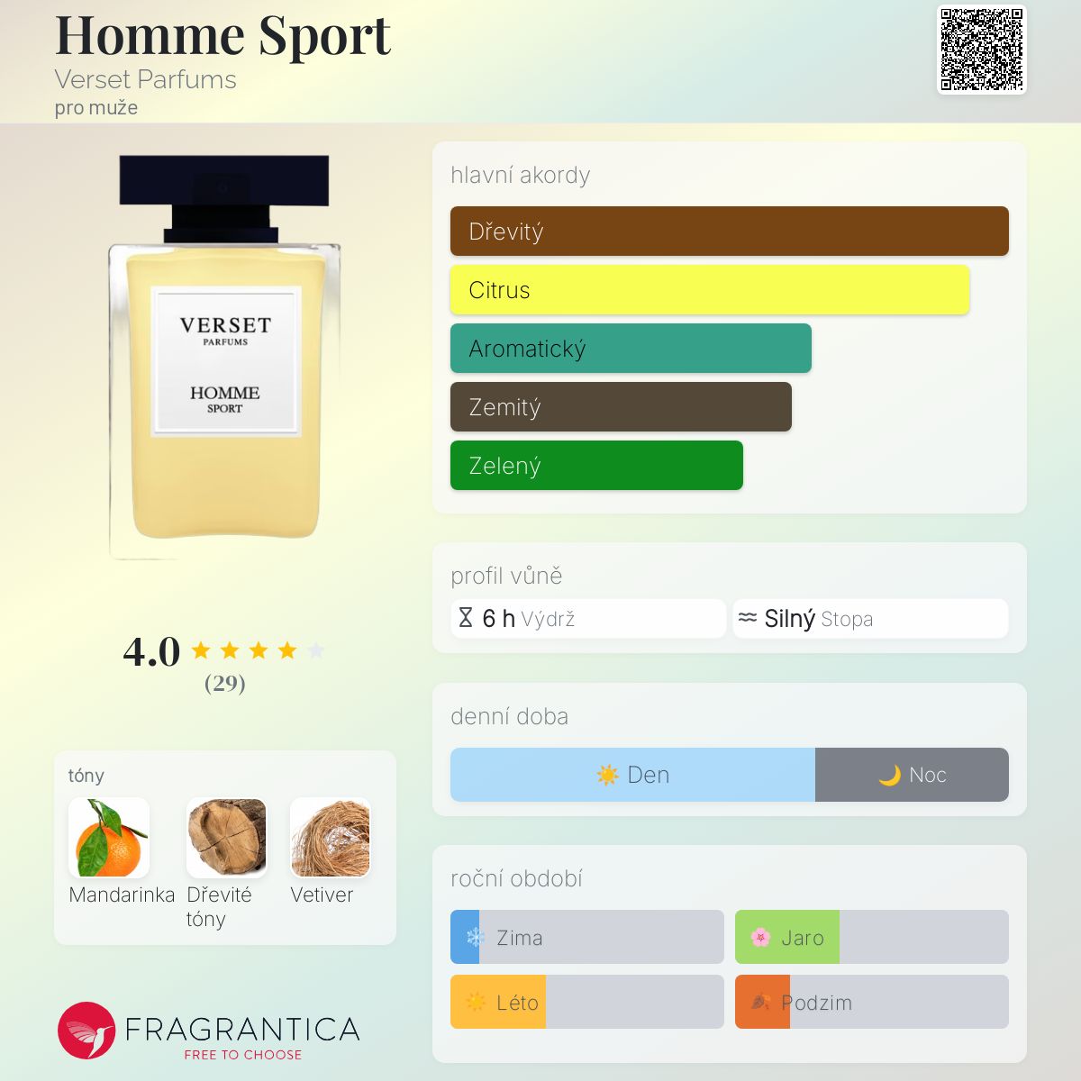 Homme Sport podle Verset Parfums je Chypre vůně pro muže. Vrchní tón je Mandarinka ; střední tón jeDřevité tóny ; základní tón je Vetiver.