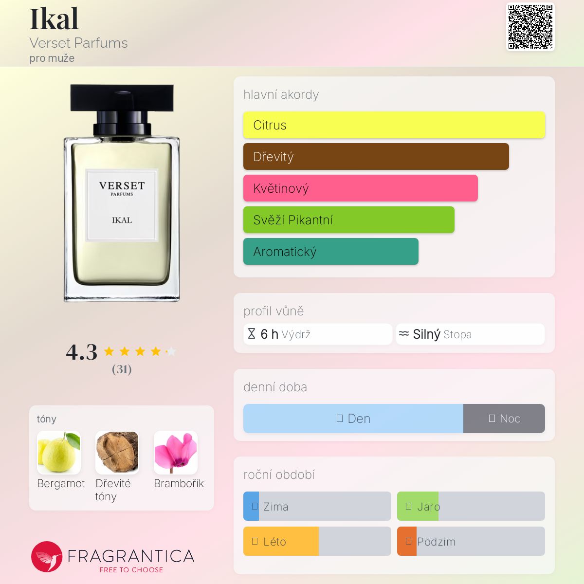 Ikal podle Verset Parfums je Chypre vůně pro muže. Vrchní tón je Bergamot ; střední tón jeBrambořík ; základní tón je Dřevité tóny.