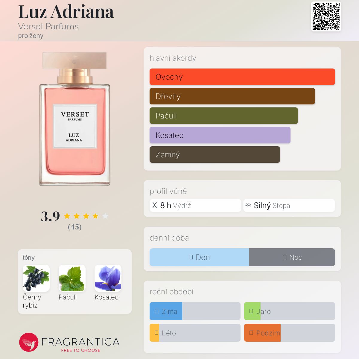 Luz Adriana podle Verset Parfums je Floral vůně pro ženy. Vrchní tón je Černý rybíz ; střední tón jeKosatec ; základní tón je Pačuli.