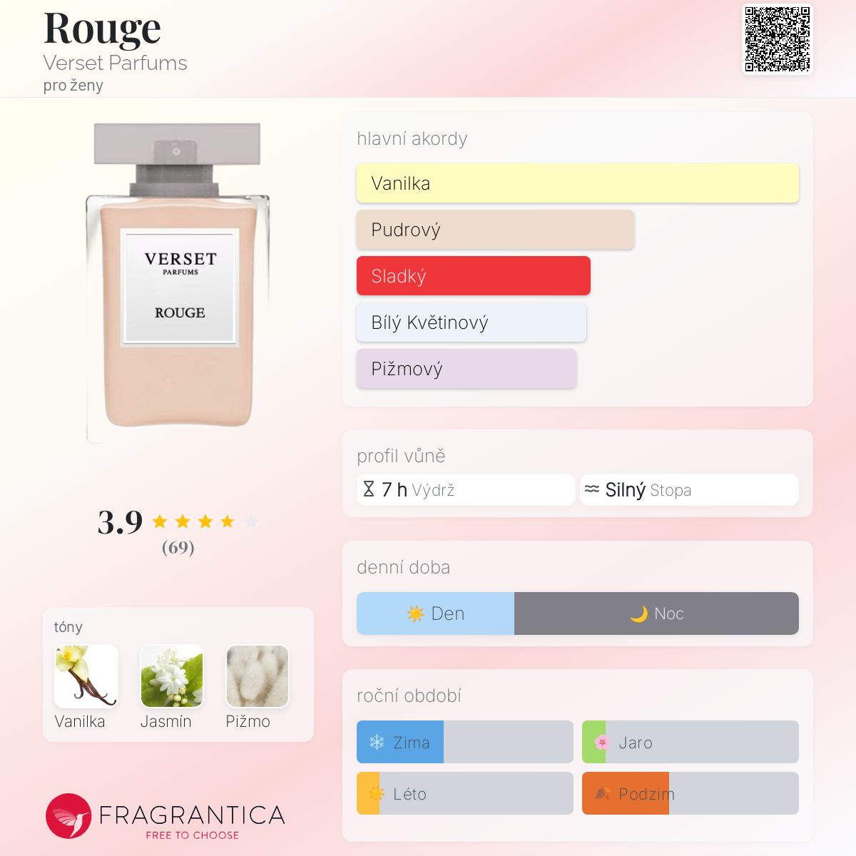 Rouge podle Verset Parfums je Orientální Spicy vůně pro ženy. Vrchní tón je Jasmín ; střední tón jeVanilka ; základní tón je Bílé pižmo.
