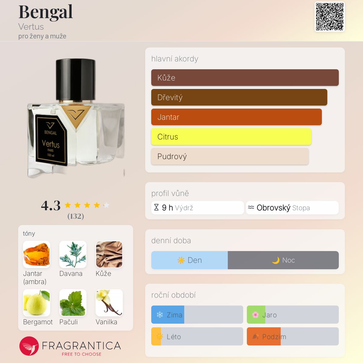 Bengal podle Vertus je Leather vůně pro ženy a muže. Bengal byl/a uveden/a v roce 2023. Vrchní tóny jsou Davana, Bergamot a Zázvor; střední tóny jsouKůže, Pačuli a Růže ; základní tóny jsou Jantar (ambra), Vanilka, Semiš a Santalové dřevo.