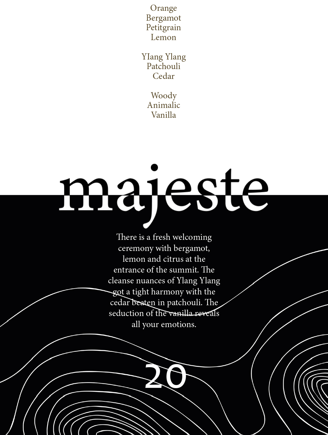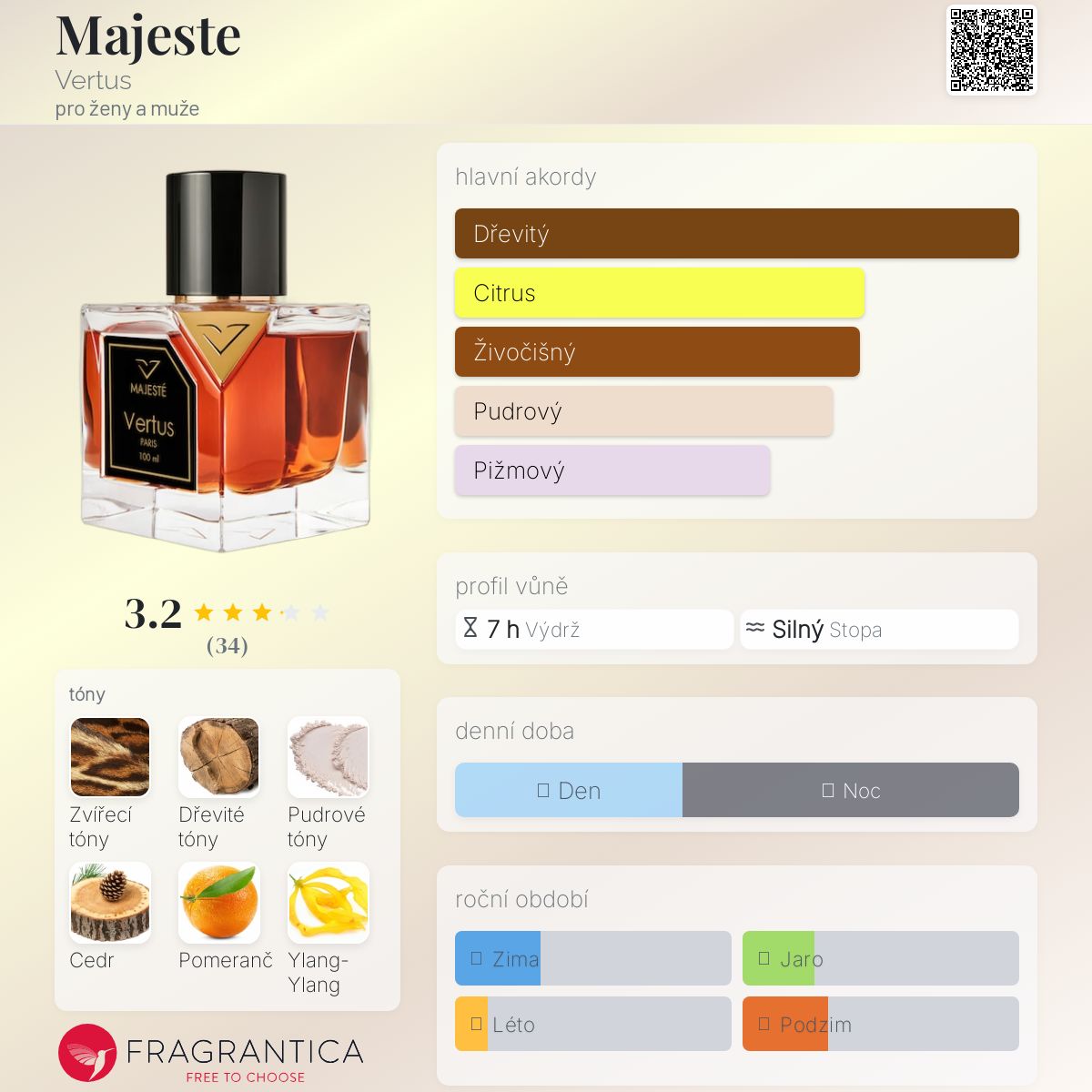 Majeste podle Vertus je vůně pro ženy a muže. Majeste byl/a uveden/a v roce 2017. Vrchní tóny jsou Pomeranč, Bergamot, Petitgrain a Citrón; střední tóny jsouCedr, Ylang-Ylang a Pačuli ; základní tóny jsou Zvířecí tóny, Dřevité tóny, Pudrové tóny a Vanilka.