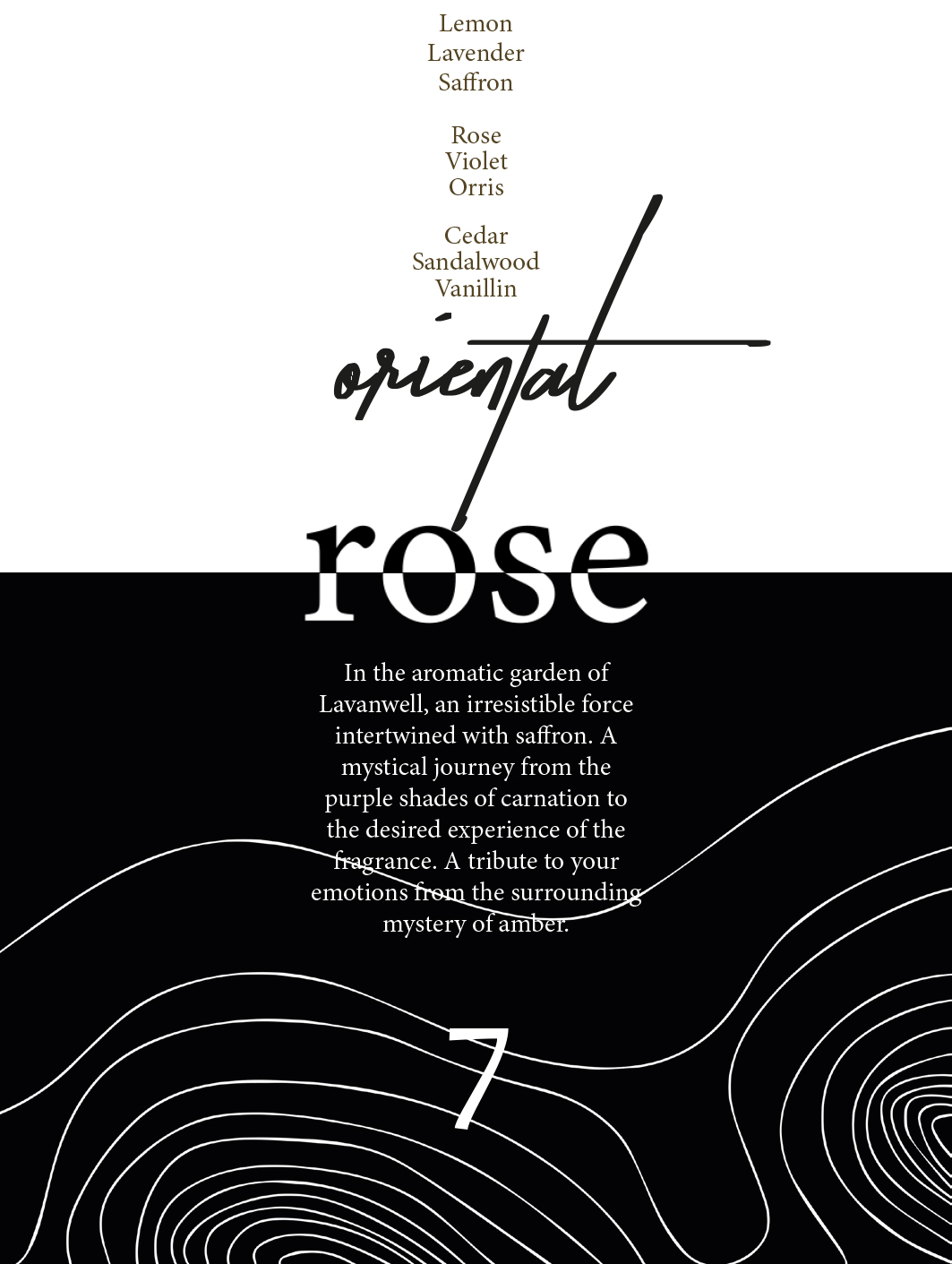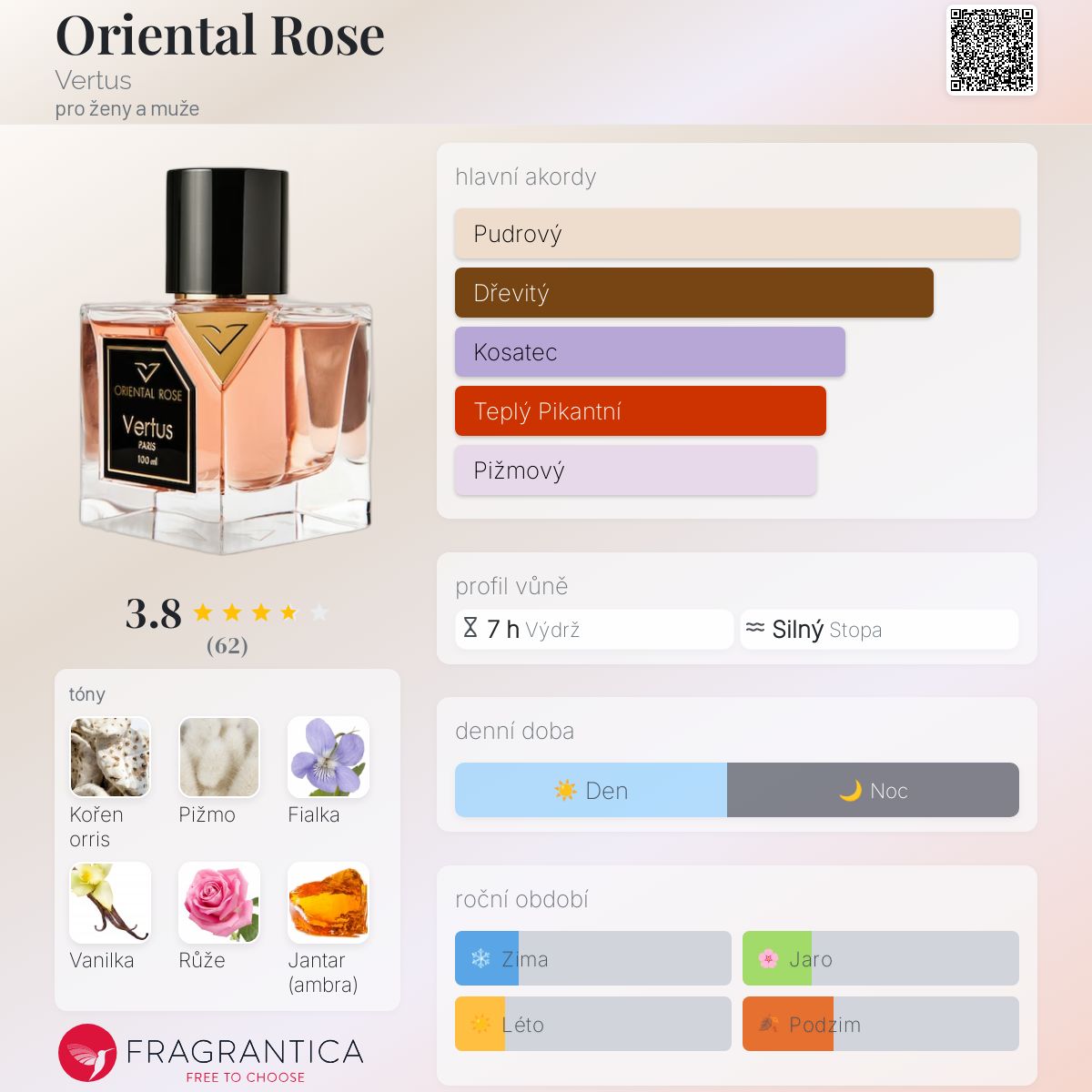 Oriental Rose podle Vertus je Orientální Floral vůně pro ženy a muže. Oriental Rose byl/a uveden/a v roce 2015. Vrchní tóny jsou Levandule, Šafrán, Kardamom, Olibanum a Citrón; střední tóny jsouOrris, Fialka, Růže, Pačuli, Guajakové dřevo a Hřebíček ; základní tóny jsou Pižmo, Vanilka, Jantar (ambra), Santalové dřevo, Vetiver a Cedr.