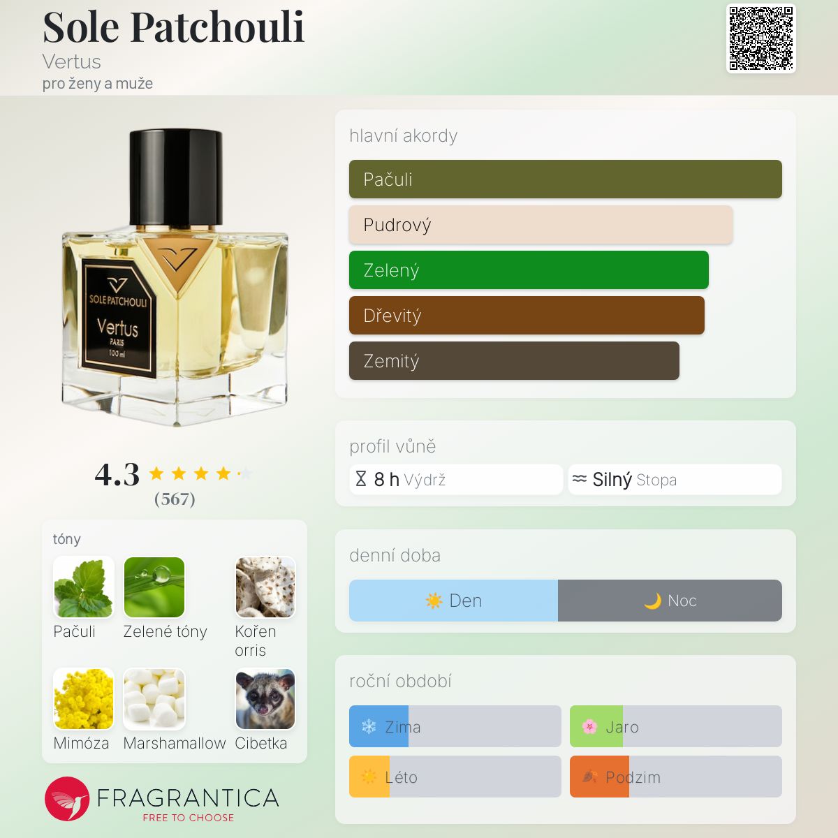 Sole Patchouli podle Vertus je vůně pro ženy a muže. Sole Patchouli byl/a uveden/a v roce 2017. Vrchní tóny jsou Pačuli, Zelené tóny a Kořen kosatce; střední tóny jsouPačuli a Mimóza ; základní tóny jsou Pačuli, Marshmallow a Cibetka.
