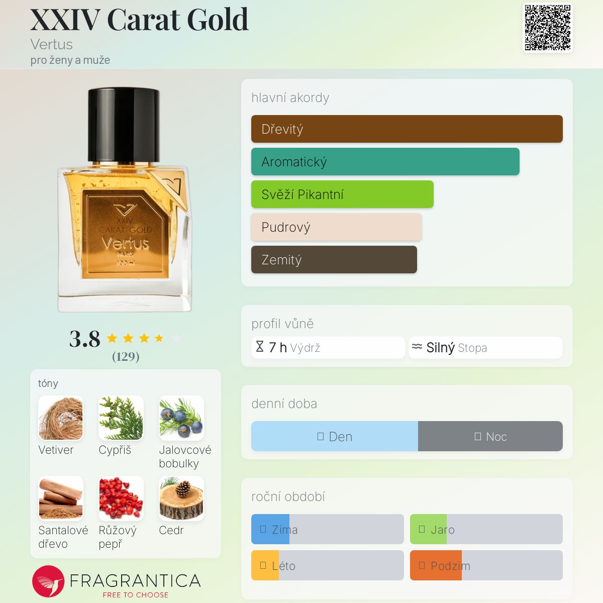 XXIV Carat Gold podle Vertus je Woody Spicy vůně pro ženy a muže. XXIV Carat Gold byl/a uveden/a v roce 2015. Vrchní tóny jsou Cypřiš, Jalovcové bobulky a Aldehydy; střední tóny jsouRůžový pepř a Fialka ; základní tóny jsou Vetiver, Santalové dřevo, Cedr, Tabák a Pižmo.