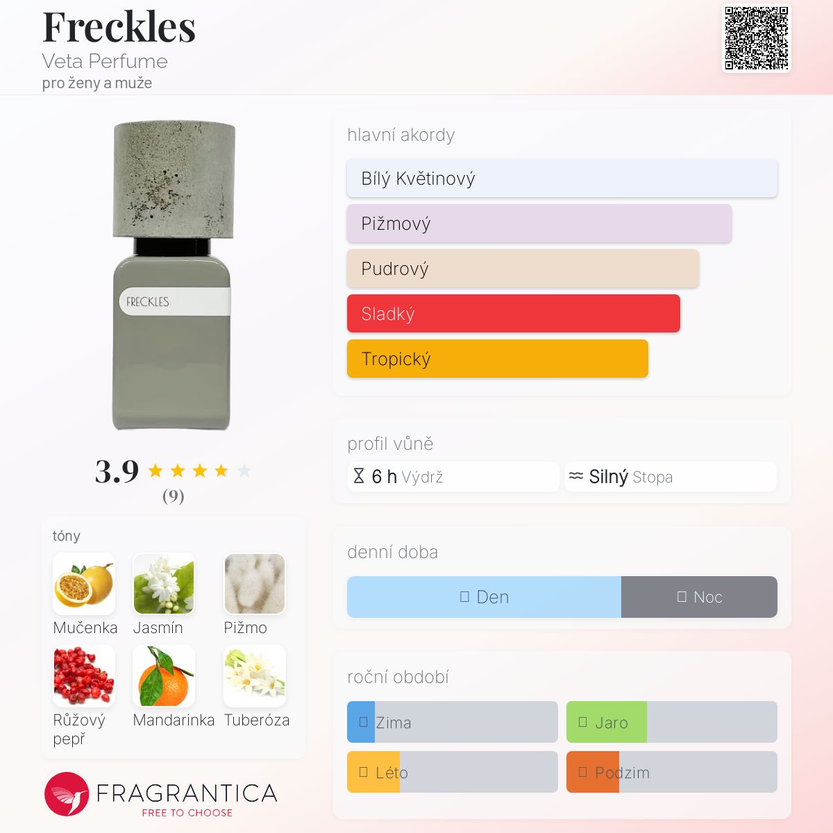 Freckles podle Veta Perfume je Orientální Floral vůně pro ženy a muže. Freckles byl/a uveden/a v roce 2021. "Nosem" za touto vůní je Elizaveta Tomilova. Vrchní tóny jsou Mučenka, Růžový pepř a Mandarinka; střední tóny jsouJasmín a Tuberóza ; základní tóny jsou Pižmo, Santalové dřevo, Vanilka a Jantar (ambra).