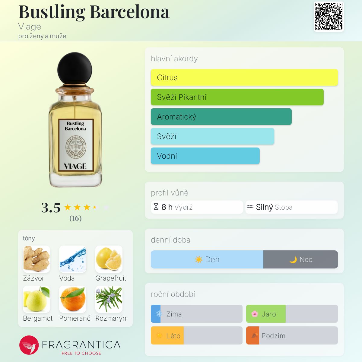 Bustling Barcelona podle Viage je vůně pro ženy a muže. Bustling Barcelona byl/a uveden/a v roce 2023. Vrchní tóny jsou Zázvor, Grapefruit, Kalábrijský bergamot, Sicilský pomeranč, Bergamot a Citrón; střední tóny jsouNigerijský zázvor, Vodní tóny, Rozmarýn, Šalvěj, Tuniské neroli, Pelargónie a Cejlonská skořice ; základní tóny jsou Černý čaj, Olibanum, Ambroxan, Guajakové dřevo, Jantar (ambra) a Labdanum.