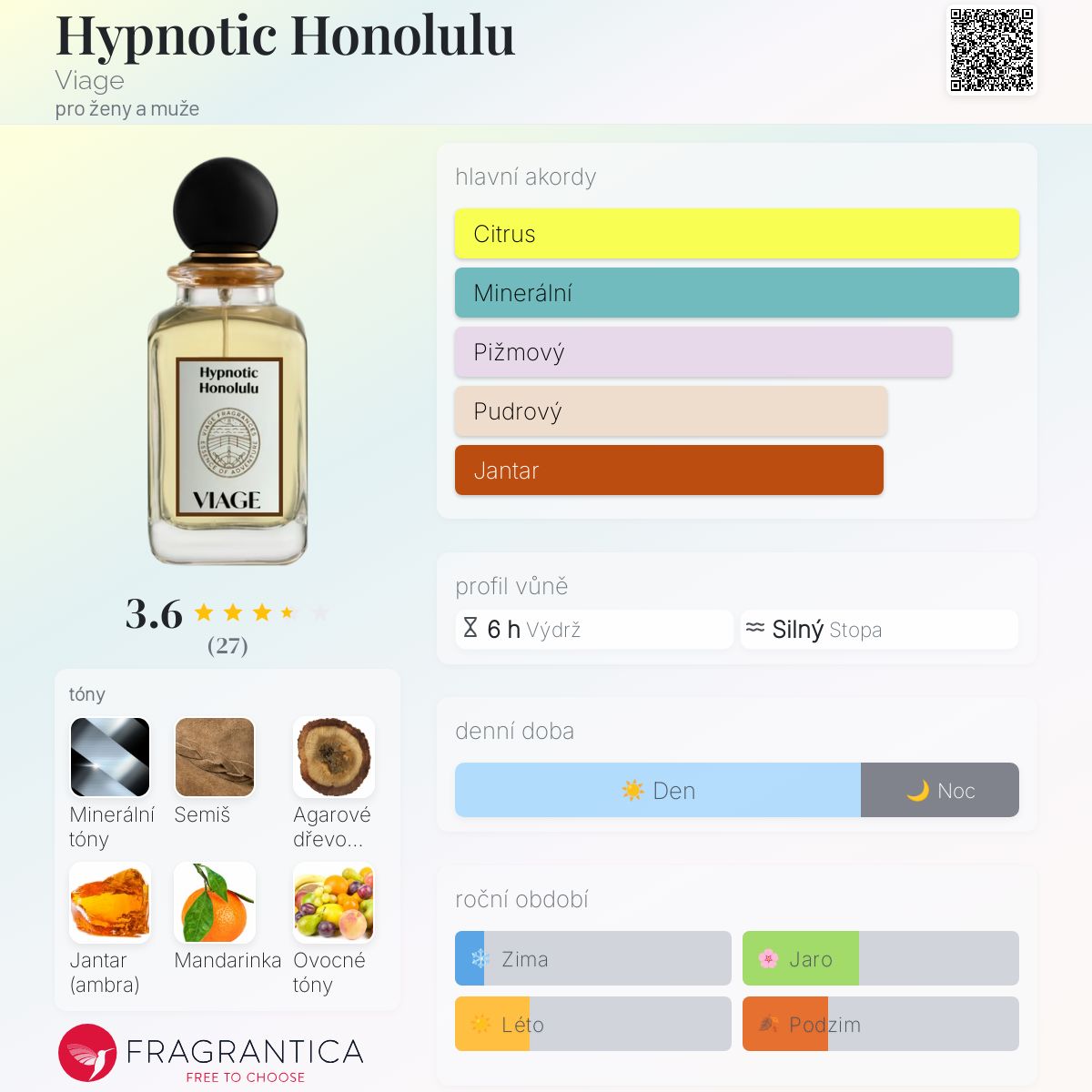 Hypnotic Honolulu podle Viage je vůně pro ženy a muže. Hypnotic Honolulu byl/a uveden/a v roce 2023. Vrchní tóny jsou Minerální tóny, Mandarinka, Bergamot, Pomeranč a Citrón; střední tóny jsouOvoce, Fialkový list, Slaměnka a Šafrán ; základní tóny jsou Semiš, Agarové dřevo (oud), Jantar (ambra), Bílé pižmo, Madagaskarská vanilka a Vonokvětka.