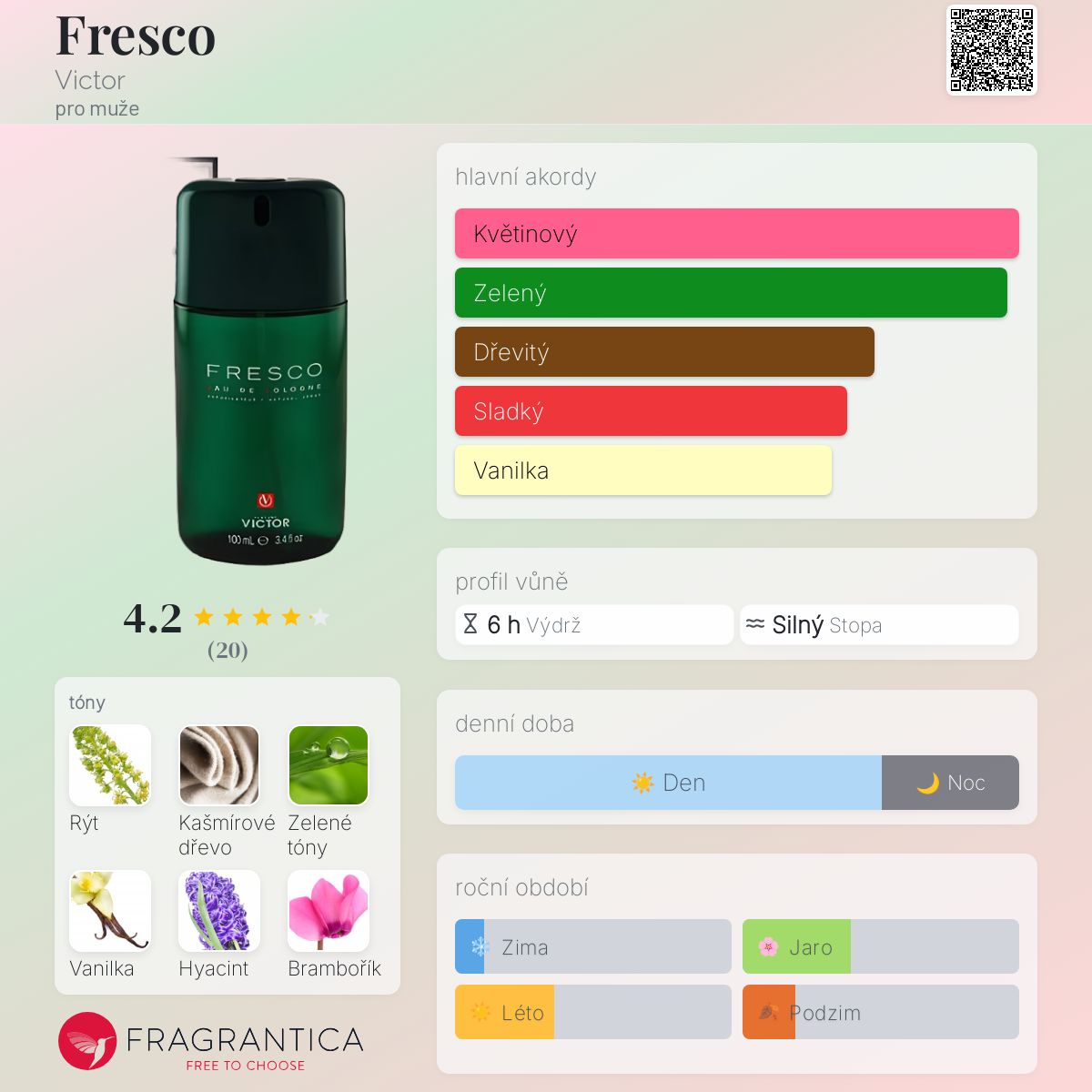 Fresco podle Victor je Aromatic vůně pro muže. Fresco byl/a uveden/a v roce 2000. Vrchní tóny jsou Zelený tón, Vanilka a Mandarinka; střední tóny jsouRýt a Modrý hyacint ; základní tóny jsou Kašmírové dřevo, Červený brambořík a Nektarinka.