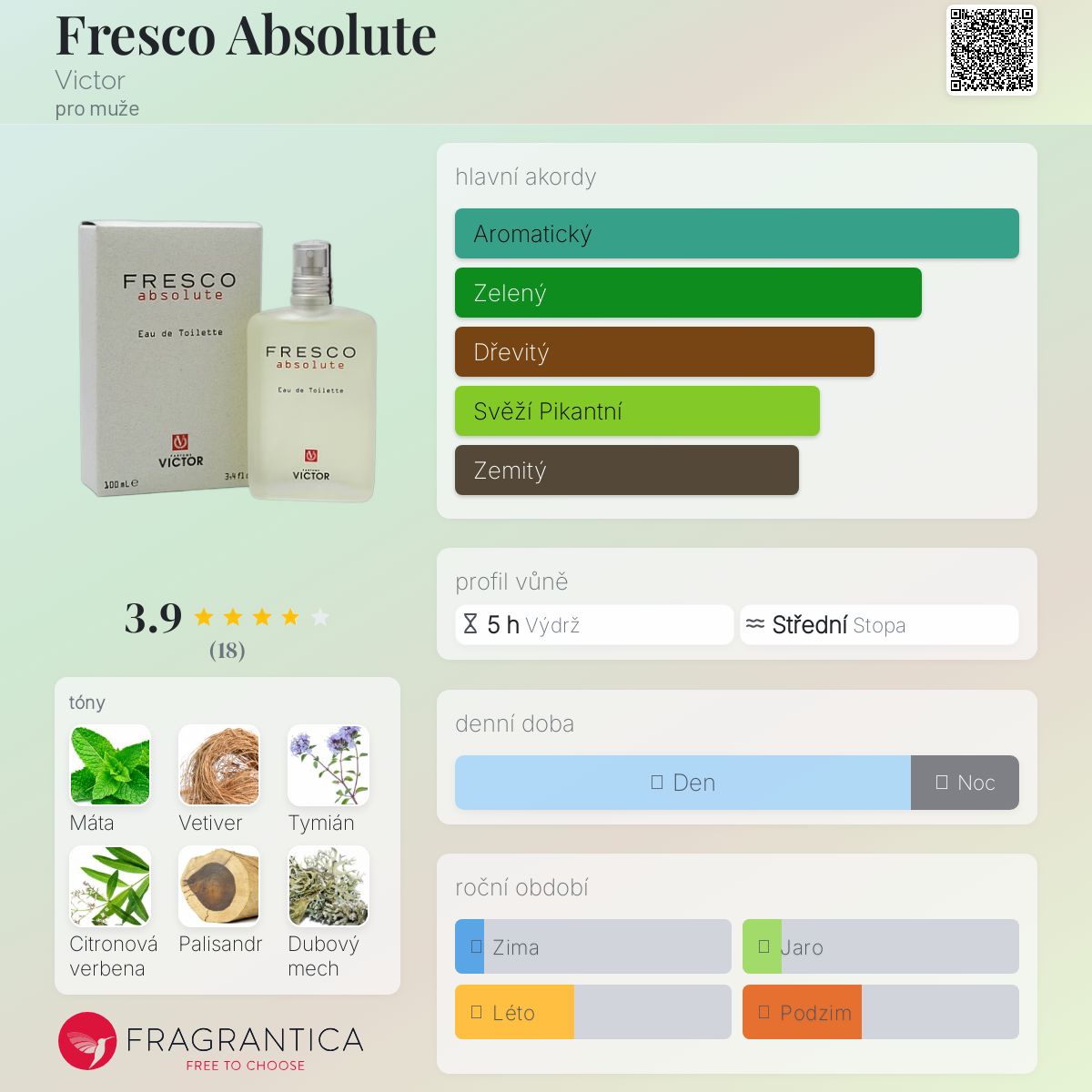 Fresco Absolute podle Victor je Woody Aromatic vůně pro muže. Fresco Absolute byl/a uveden/a v roce 1995. Vrchní tóny jsou Máta, Citronová verbena a Kardamom; střední tóny jsouTymián, Palisandr, Dubový mech a Fíkový list ; základní tóny jsou Vetiver, Pižmo a Kašmírové dřevo.