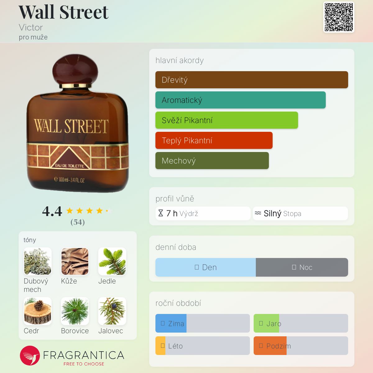 Wall Street podle Victor je Orientální Fougere vůně pro muže. Wall Street byl/a uveden/a v roce 1984. Vrchní tóny jsou Jalovec, Pelyněk, Bazalka, Bergamot, Zelené tóny a Citrón; střední tóny jsouCedr, Jehličí borovice, Jasmín, Pačuli, Skořice, Karafiát a Růže ; základní tóny jsou Dubový mech, Kůže, Jedle balzámová, Jantar (ambra) a Pižmo.