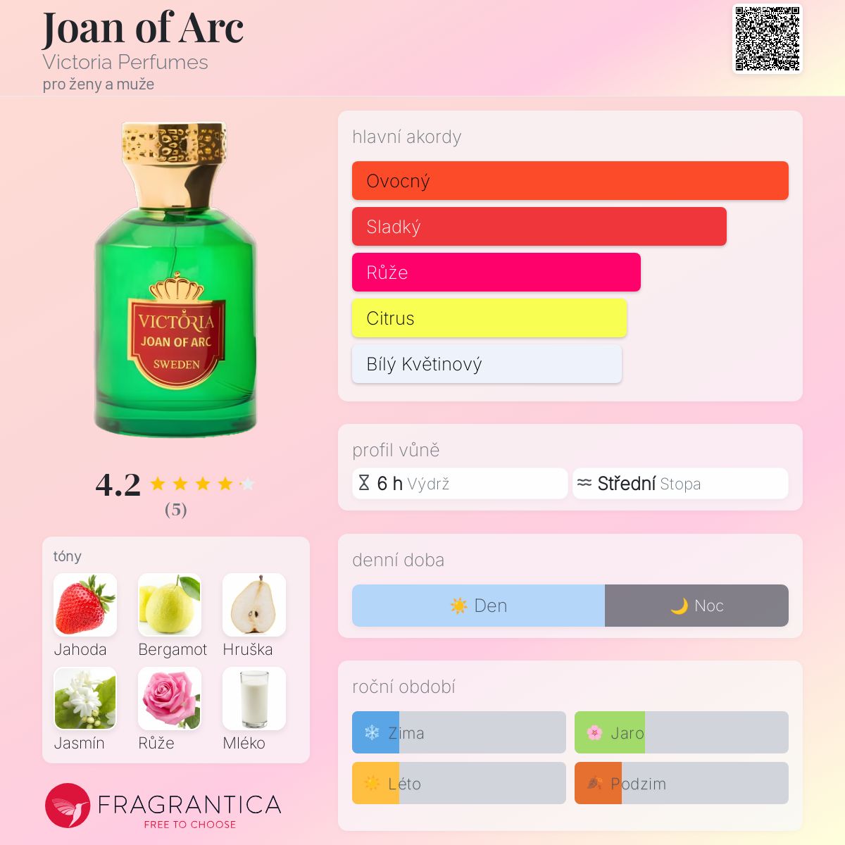 Joan of Arc podle Victoria Perfumes je Floral vůně pro ženy a muže. Joan of Arc byl/a uveden/a v roce 2023. "Nosem" za touto vůní je Sfean J.A.. Vrchní tóny jsou Jahoda, Bergamot a Hruška; střední tóny jsouJasmín, Růže a Mléko ; základní tóny jsou Maliny, Styrax a Pižmo.
