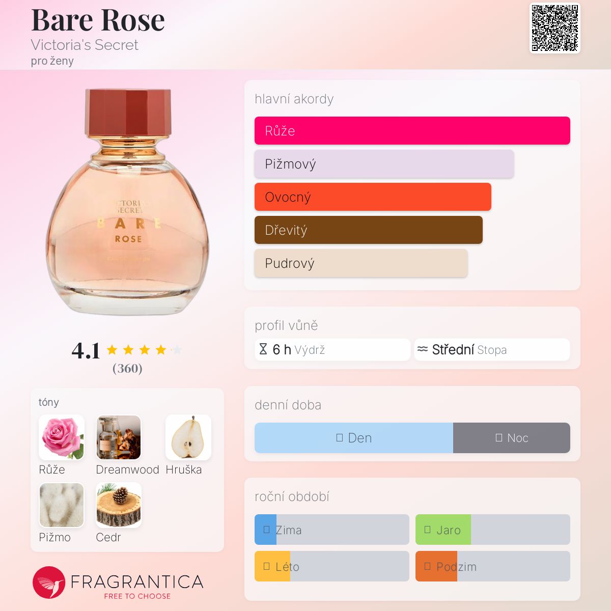 Bare Rose podle Victoria's Secret je Woody Floral Musk vůně pro ženy. Bare Rose byl/a uveden/a v roce 2023. "Nosem" za touto vůní je Frank Voelkl. Vrchní tón je Hruška ; střední tón jeRůže ; základní tóny jsou Dreamwood, Pižmo a Cedr.