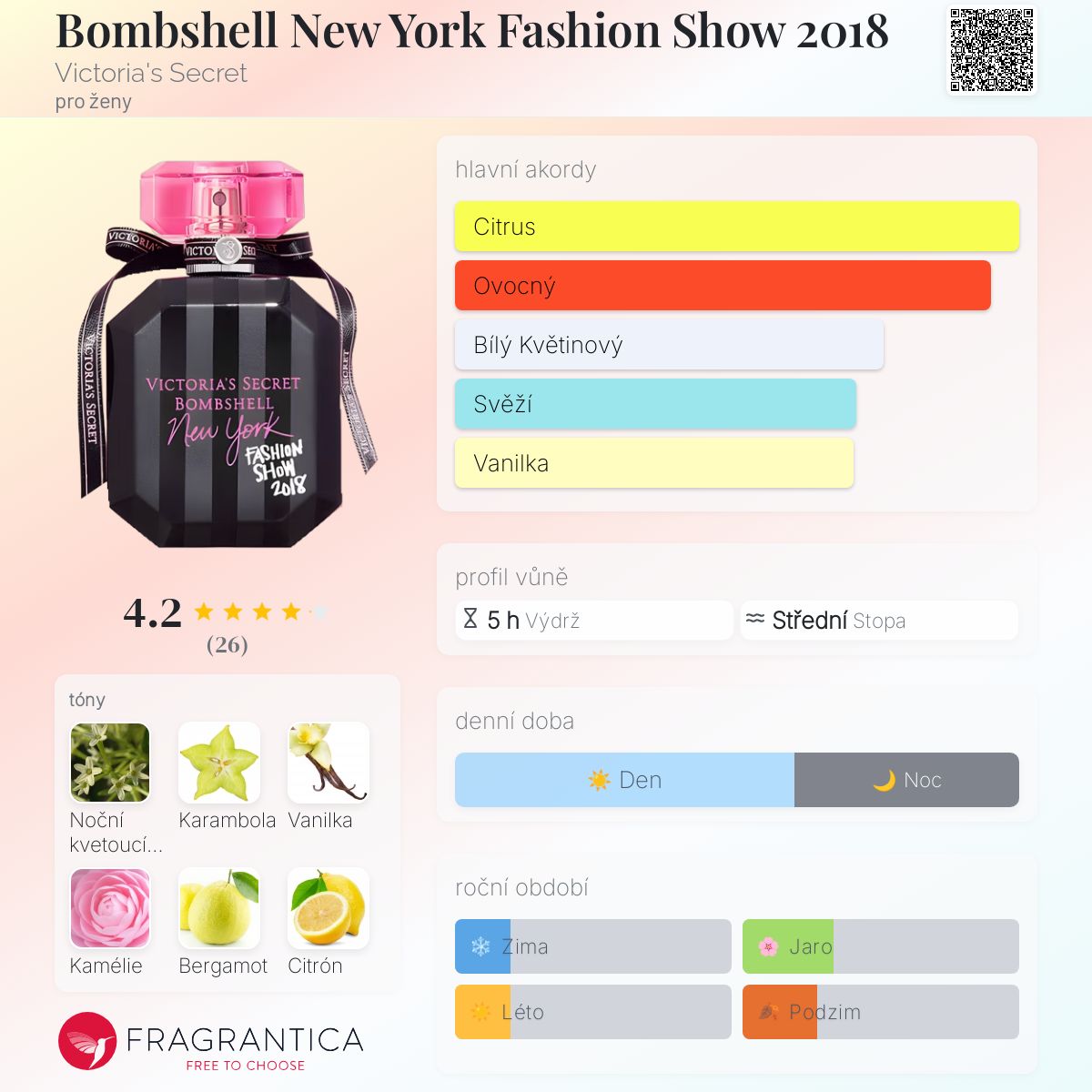 Bombshell New York Fashion Show 2018 podle Victoria's Secret je Floral Fruity vůně pro ženy. Bombshell New York Fashion Show 2018 byl/a uveden/a v roce 2018. Vrchní tóny jsou Karambola, Kalábrijský bergamot a Citrón; střední tóny jsouNoční kvetoucí jasmín, Kamélie a Led ; základní tón je Madagaskarská vanilka.