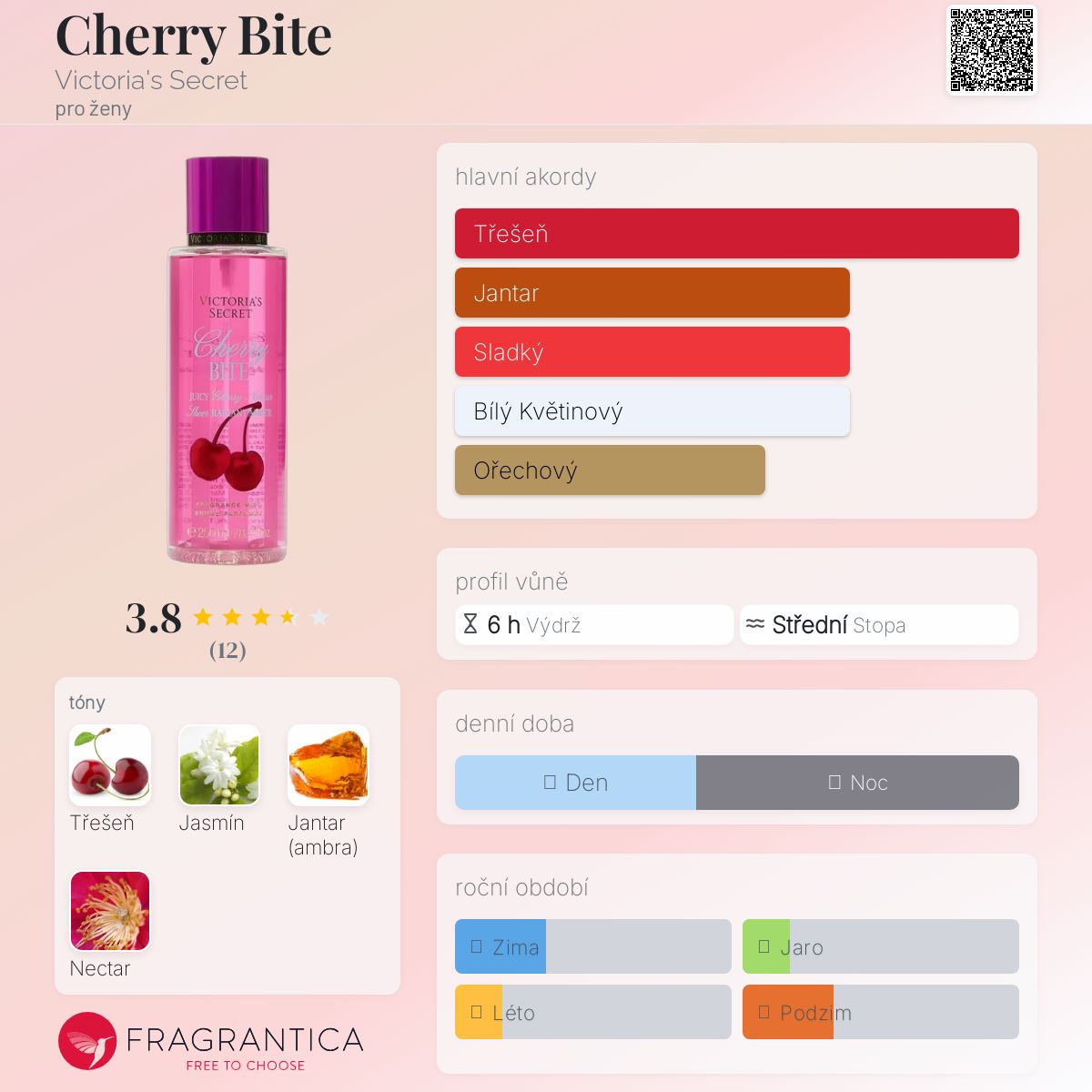 Cherry Bite podle Victoria's Secret je Floral Fruity vůně pro ženy. Toto je nová vůně. Cherry Bite byl/a uveden/a v roce 2025. Vrchní tóny jsou Třešeň a Nectar; střední tón jeJasmín mnohokvětý ; základní tón je Jantar (ambra).