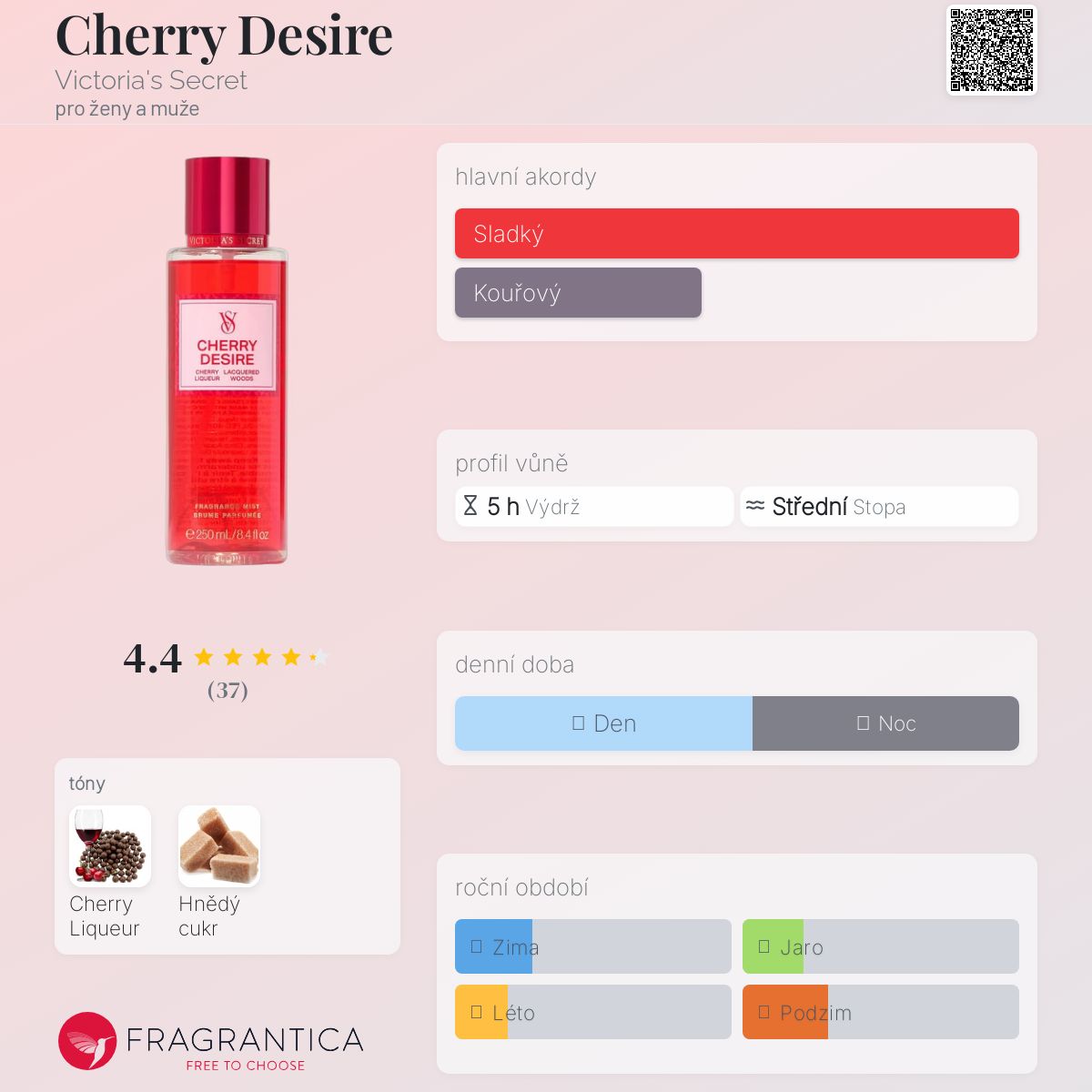 Cherry Desire podle Victoria's Secret je vůně pro ženy a muže. Toto je nová vůně. Cherry Desire byl/a uveden/a v roce 2025. Vrchní tón je Třešňový likér ; střední tón jeHnědý cukr ;