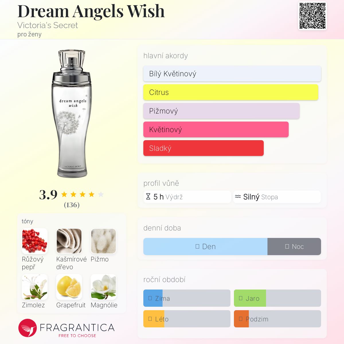 Dream Angels Wish podle Victoria's Secret je Floral Fruity vůně pro ženy. Dream Angels Wish byl/a uveden/a v roce 2008. Vrchní tóny jsou Růžový pepř, Grapefruit a Bergamot; střední tóny jsouZimolez, Magnólie, Pomerančový květ, Orchidej a Jasmín ; základní tóny jsou Kašmírové dřevo, Pižmo a Vanilka.