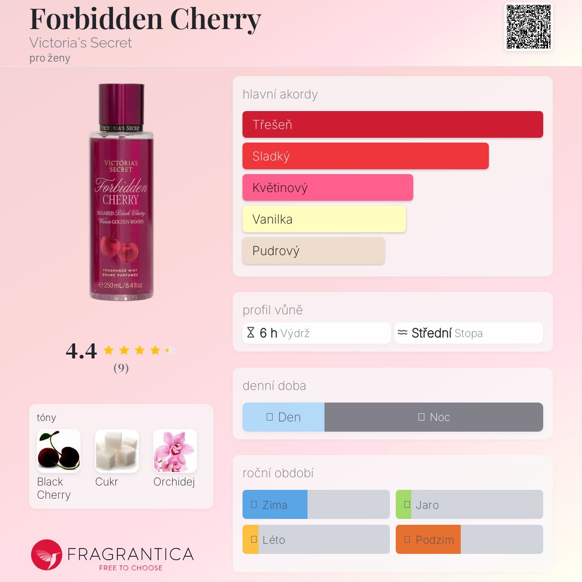 Forbidden Cherry podle Victoria's Secret je Floral Fruity vůně pro ženy. Toto je nová vůně. Forbidden Cherry byl/a uveden/a v roce 2025. Vrchní tóny jsou Černá třešeň a Cukr; střední tón jeVanilková orchidej ;