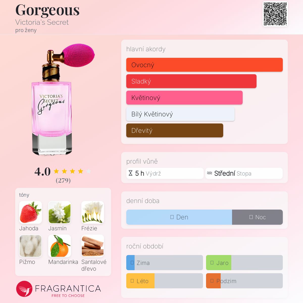 Gorgeous podle Victoria's Secret je Floral Fruity vůně pro ženy. Gorgeous byl/a uveden/a v roce 2011. Vrchní tóny jsou Jahoda a Mandarinka; střední tóny jsouJasmín a Frézie ; základní tóny jsou Pižmo a Santalové dřevo.
