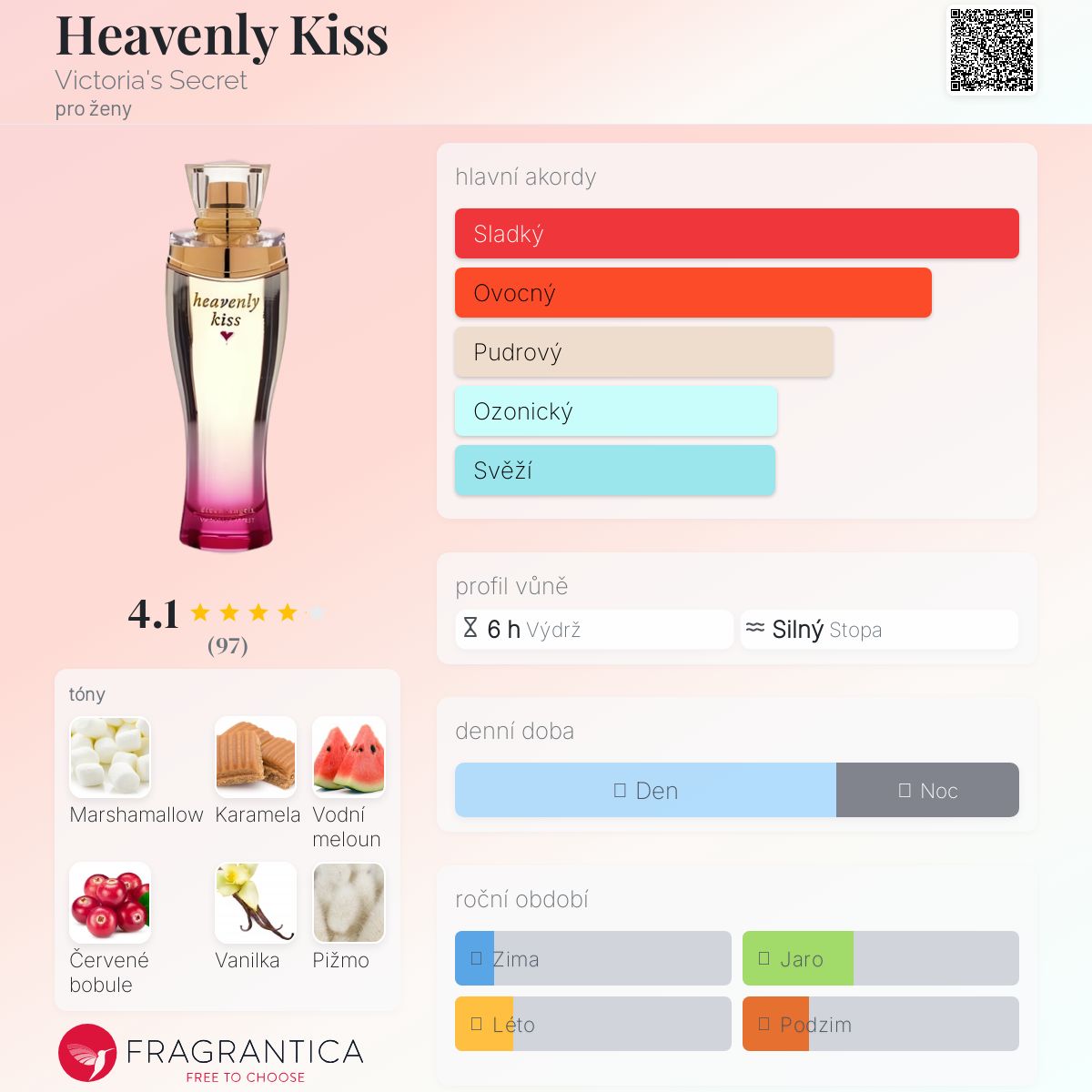 Heavenly Kiss podle Victoria's Secret je Floral Fruity vůně pro ženy. Heavenly Kiss byl/a uveden/a v roce 2008. Vrchní tóny jsou Vodní meloun, Červené bobule a Červený rybíz; střední tóny jsouFrézie, Guava, Jasmín a Meruňka ; základní tóny jsou Marshamallow, Karamela, Vanilka a Pižmo.