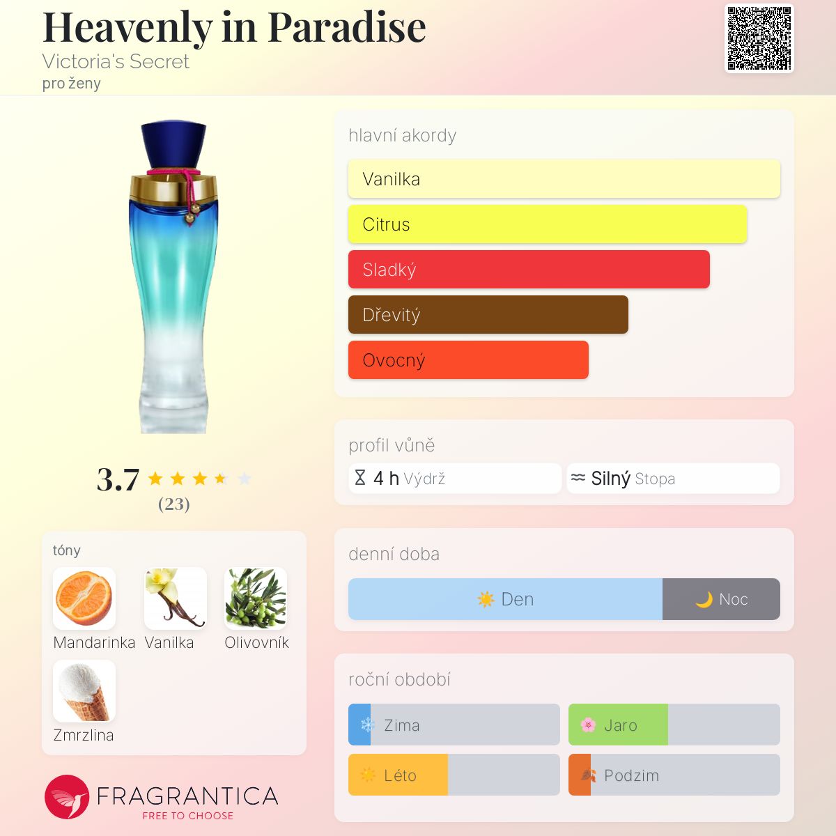 Heavenly in Paradise podle Victoria's Secret je Aromatic vůně pro ženy. Heavenly in Paradise byl/a uveden/a v roce 2013. Vrchní tón je Mandarinka ; střední tóny jsouVanilka a Zmrzlina ; základní tón je Olivovník.