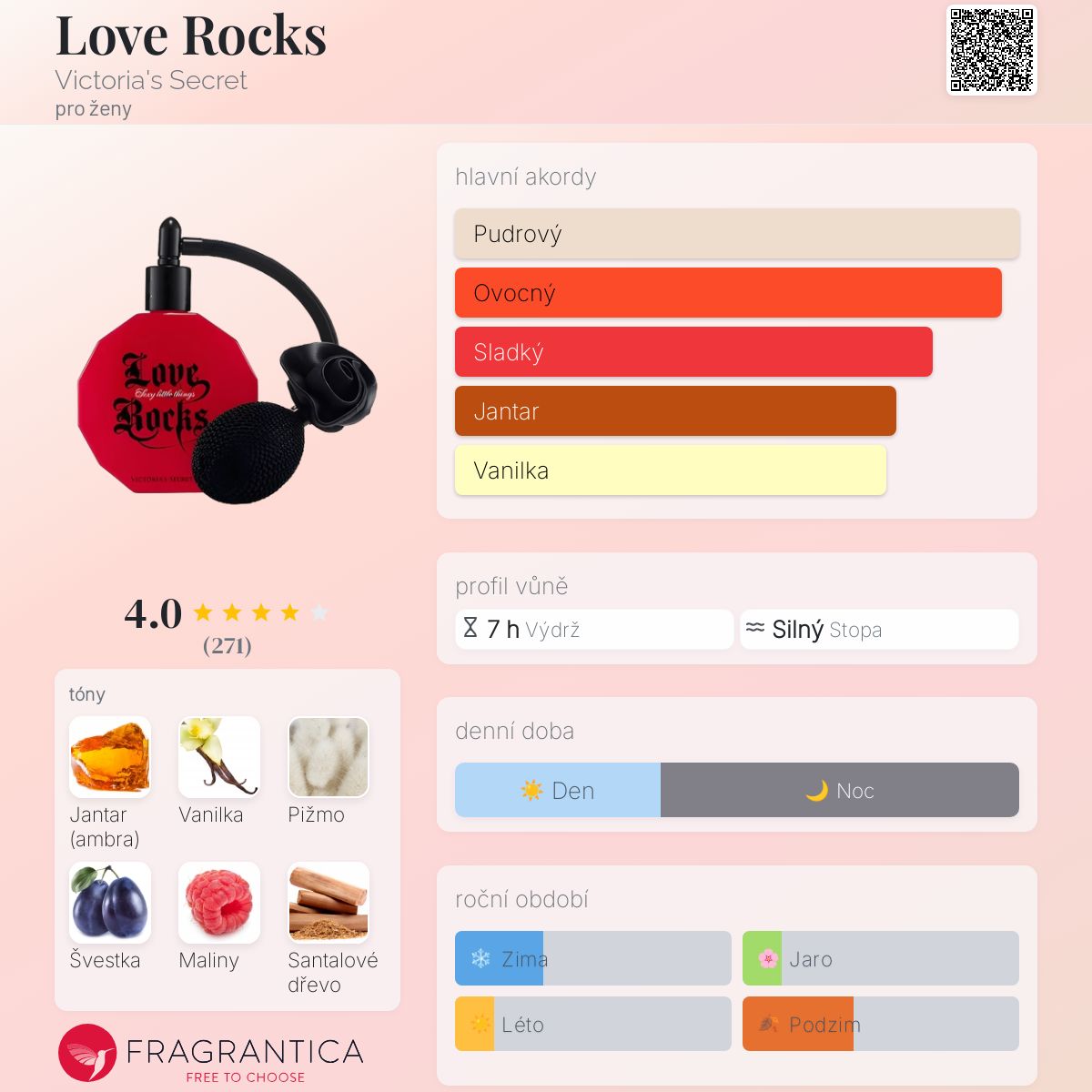 Love Rocks podle Victoria's Secret je Floral Fruity vůně pro ženy. Love Rocks byl/a uveden/a v roce 2009. Vrchní tóny jsou Maliny, Pivoňka a Bergamot; střední tóny jsouŠvestka, Santalové dřevo, Jasmín a Stephanotis ; základní tóny jsou Jantar (ambra), Vanilka, Pižmo a Fialka.