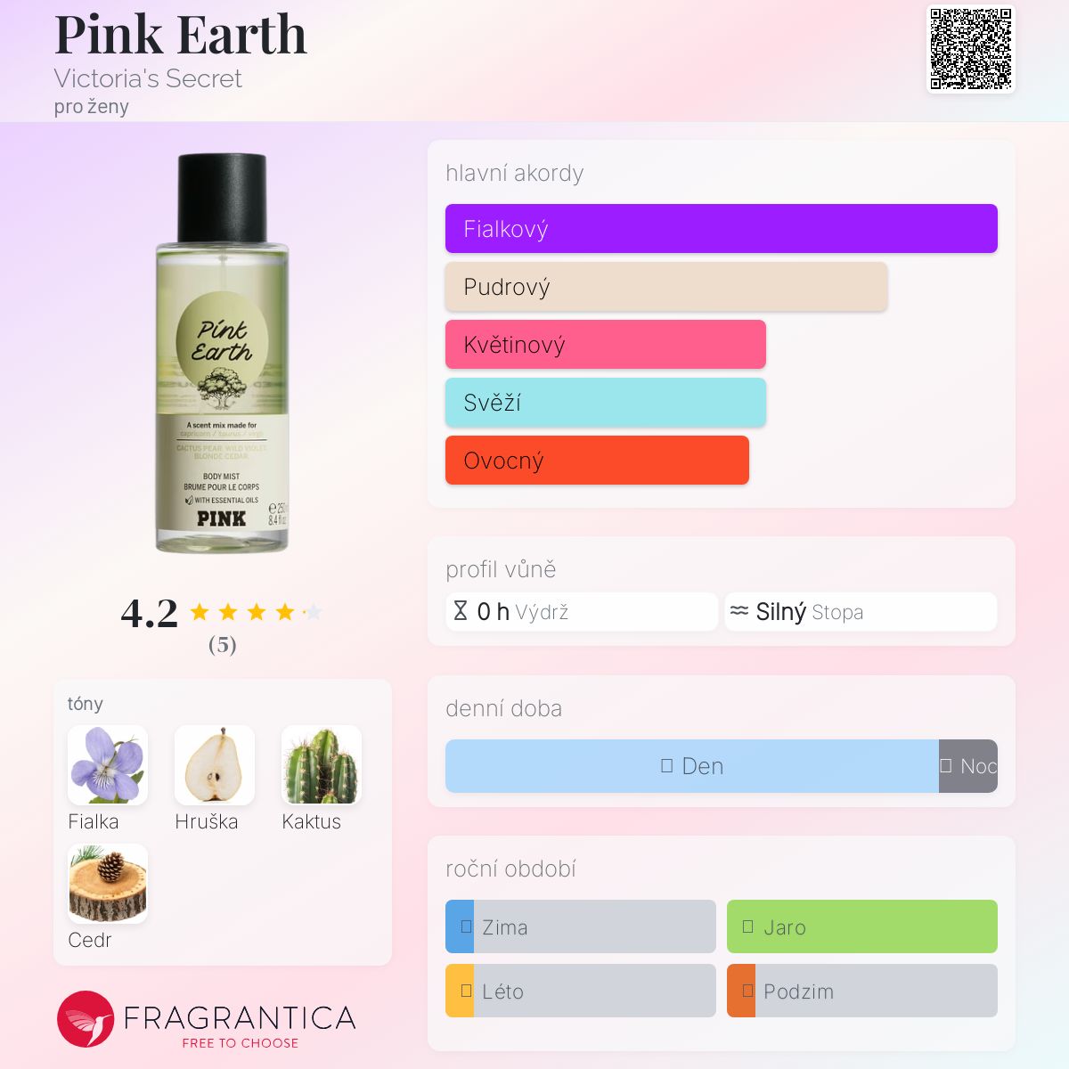 Pink Earth podle Victoria's Secret je Woody Aromatic vůně pro ženy. Pink Earth byl/a uveden/a v roce 2021. Vrchní tóny jsou Hruška a Kaktus; střední tón jeFialka ; základní tón je Cedr.