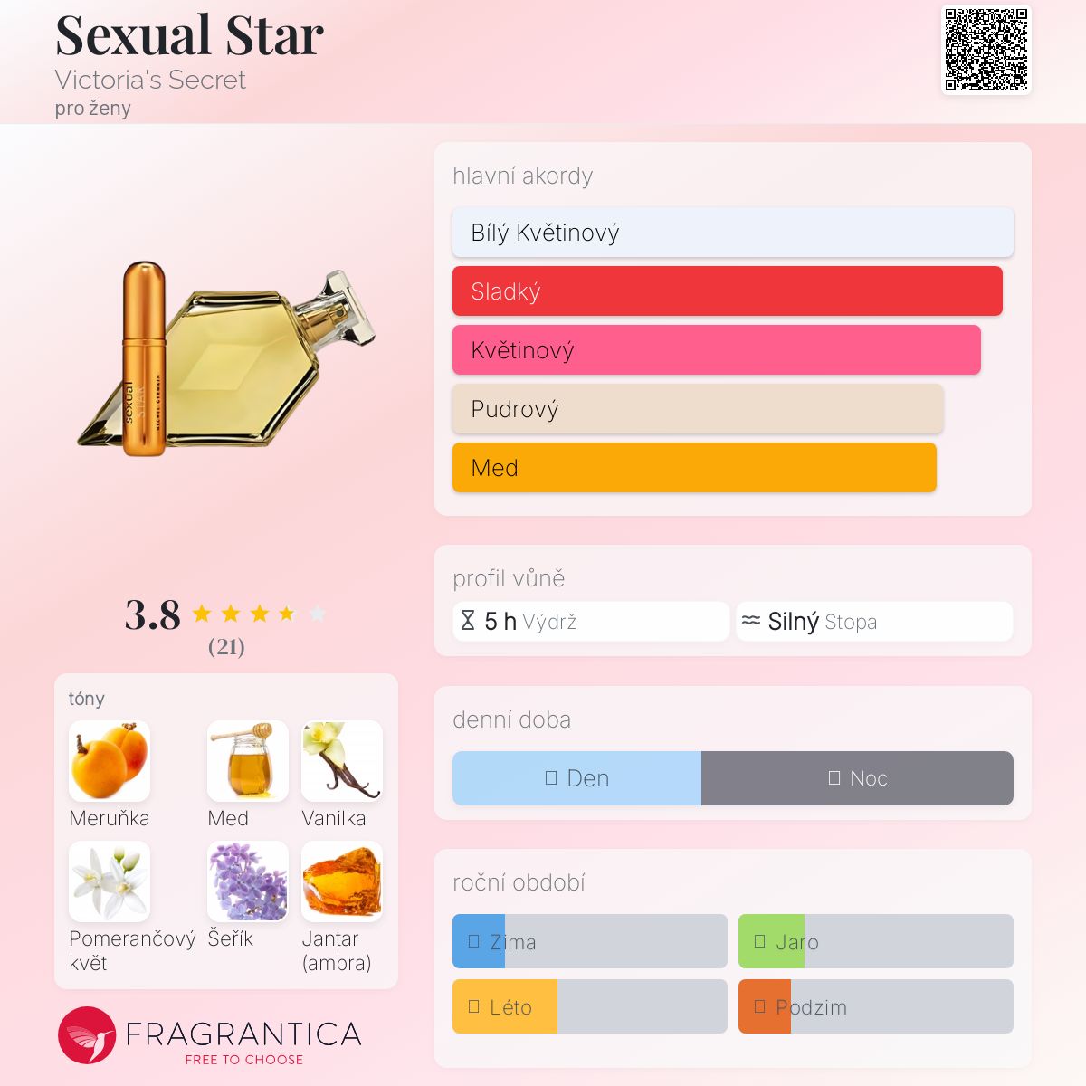 Sexual Star podle Victoria's Secret je Floral Fruity vůně pro ženy. Sexual Star byl/a uveden/a v roce 2009. Vrchní tóny jsou Meruňka, Květ afrického pomeranče a Šalvěj; střední tóny jsouMed, Šeřík a Egyptský jasmín ; základní tóny jsou Madagaskarská vanilka, Jantar (ambra) a Santalové dřevo.