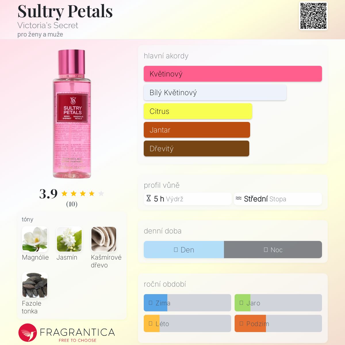 Sultry Petals podle Victoria's Secret je Floral vůně pro ženy a muže. Toto je nová vůně. Sultry Petals byl/a uveden/a v roce 2025. střední tóny jsouOkvětní lístky mólagnie a Jasmín ; základní tóny jsou Kašmírové dřevo a Fazole tonka.