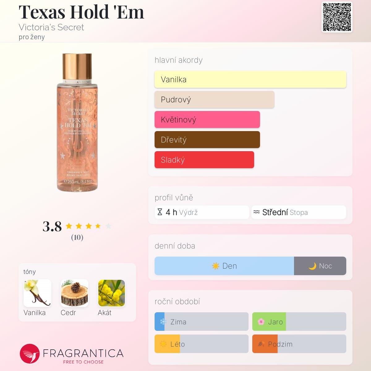Texas Hold 'Em podle Victoria's Secret je Floral vůně pro ženy. Toto je nová vůně. Texas Hold 'Em byl/a uveden/a v roce 2024.