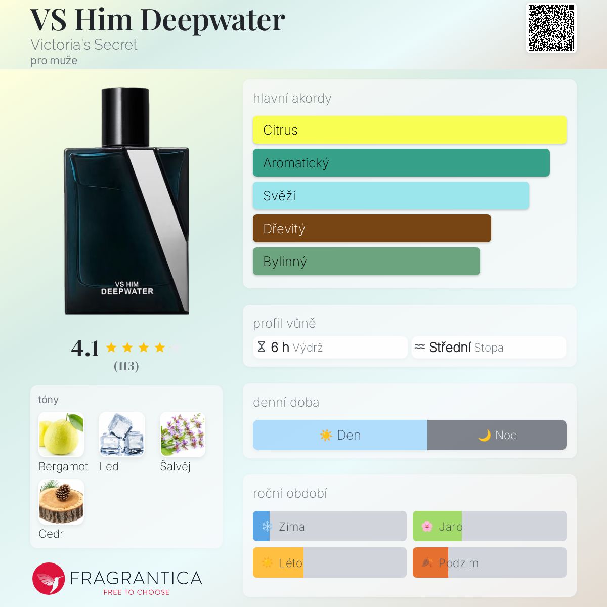VS Him Deepwater podle Victoria's Secret je Orientální Fougere vůně pro muže. VS Him Deepwater byl/a uveden/a v roce 2021. VS Him Deepwater byl/a vytvořen/a Olivier Cresp a Sébastien Cresp. Vrchní tóny jsou Bergamot a Led; střední tón jeModrá šalvěj ; základní tón je Cedrové jehly.