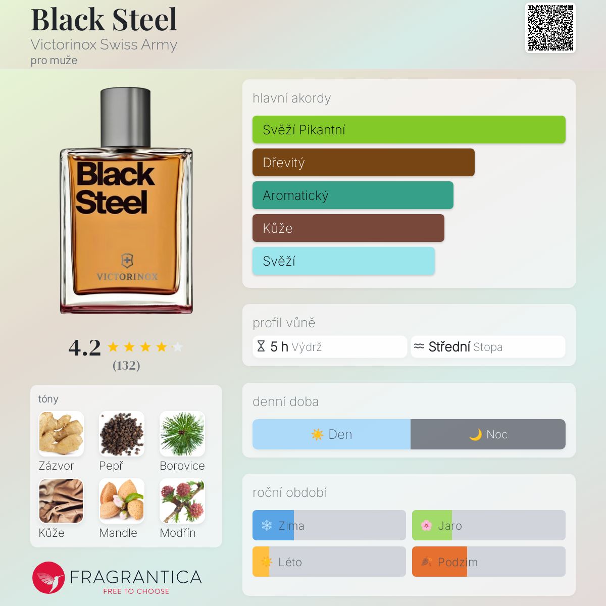 Black Steel podle Victorinox Swiss Army je Leather vůně pro muže. Black Steel byl/a uveden/a v roce 2020. "Nosem" za touto vůní je Daphné Bugey. Vrchní tóny jsou Zázvor a Černý pepř; střední tóny jsouKůže a Modřín ; základní tóny jsou Borovice a Mandle.