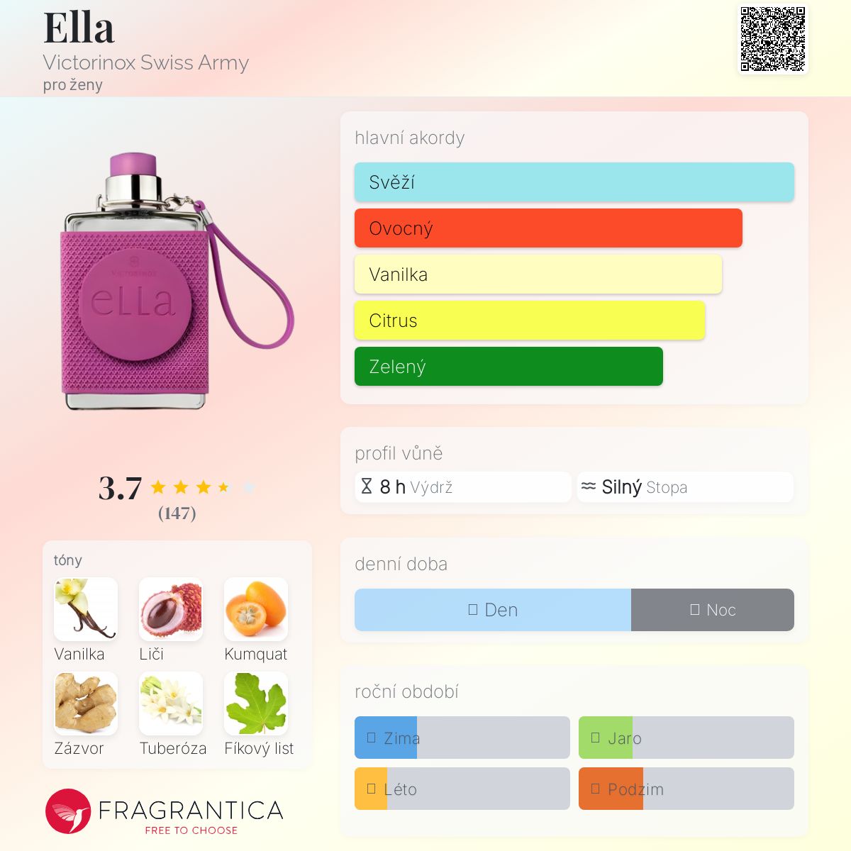 Ella podle Victorinox Swiss Army je Orientální Floral vůně pro ženy. Ella byl/a uveden/a v roce 2014. Vrchní tóny jsou Liči, Kumquat a Fíkový list; střední tóny jsouZázvor, Tuberóza a Vonokvětka ; základní tóny jsou Vanilka, Palisandr a Jantar (ambra).