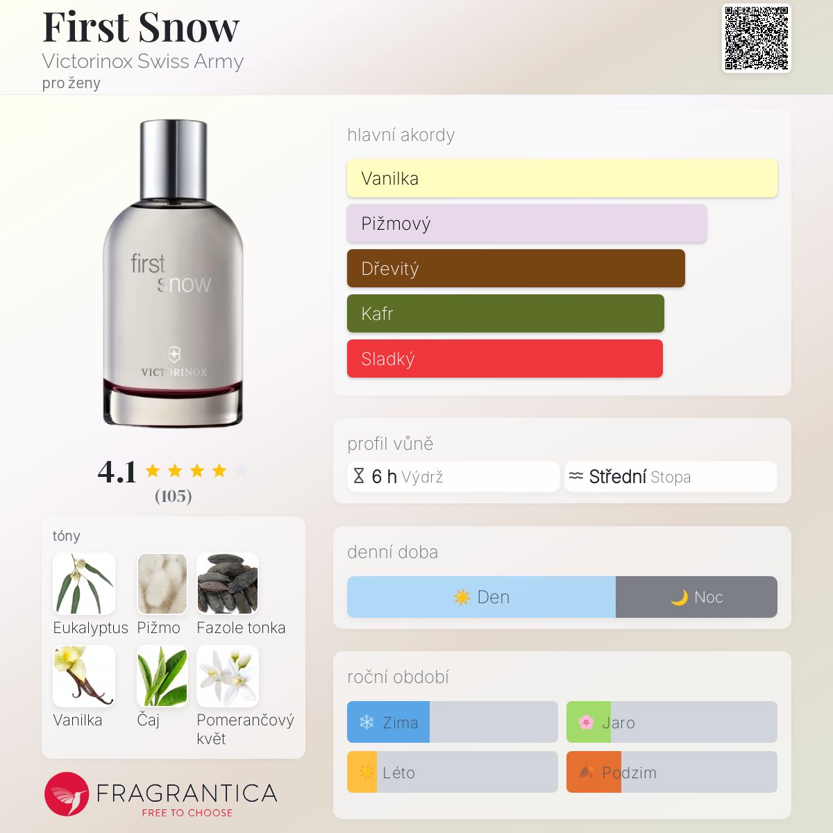 First Snow podle Victorinox Swiss Army je Floral Green vůně pro ženy. First Snow byl/a uveden/a v roce 2021. "Nosem" za touto vůní je Ane Ayo. Vrchní tóny jsou Eukalyptus a Bílý čaj; střední tóny jsouVanilka a Pomerančový květ ; základní tóny jsou Bílé pižmo a Fazole tonka.