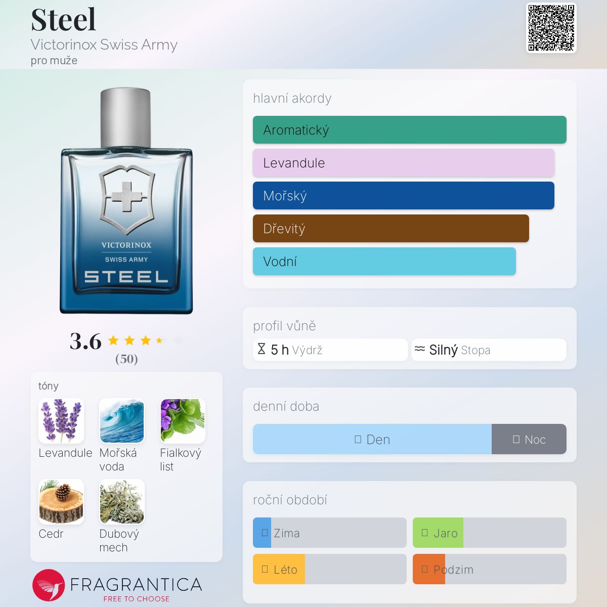 Steel podle Victorinox Swiss Army je Aromatic Aquatic vůně pro muže. Steel byl/a uveden/a v roce 2018. "Nosem" za touto vůní je Christophe Raynaud. Vrchní tóny jsou Levandule a Fialkový list; střední tóny jsouMořské tóny a Mech ; základní tón je Cedr.