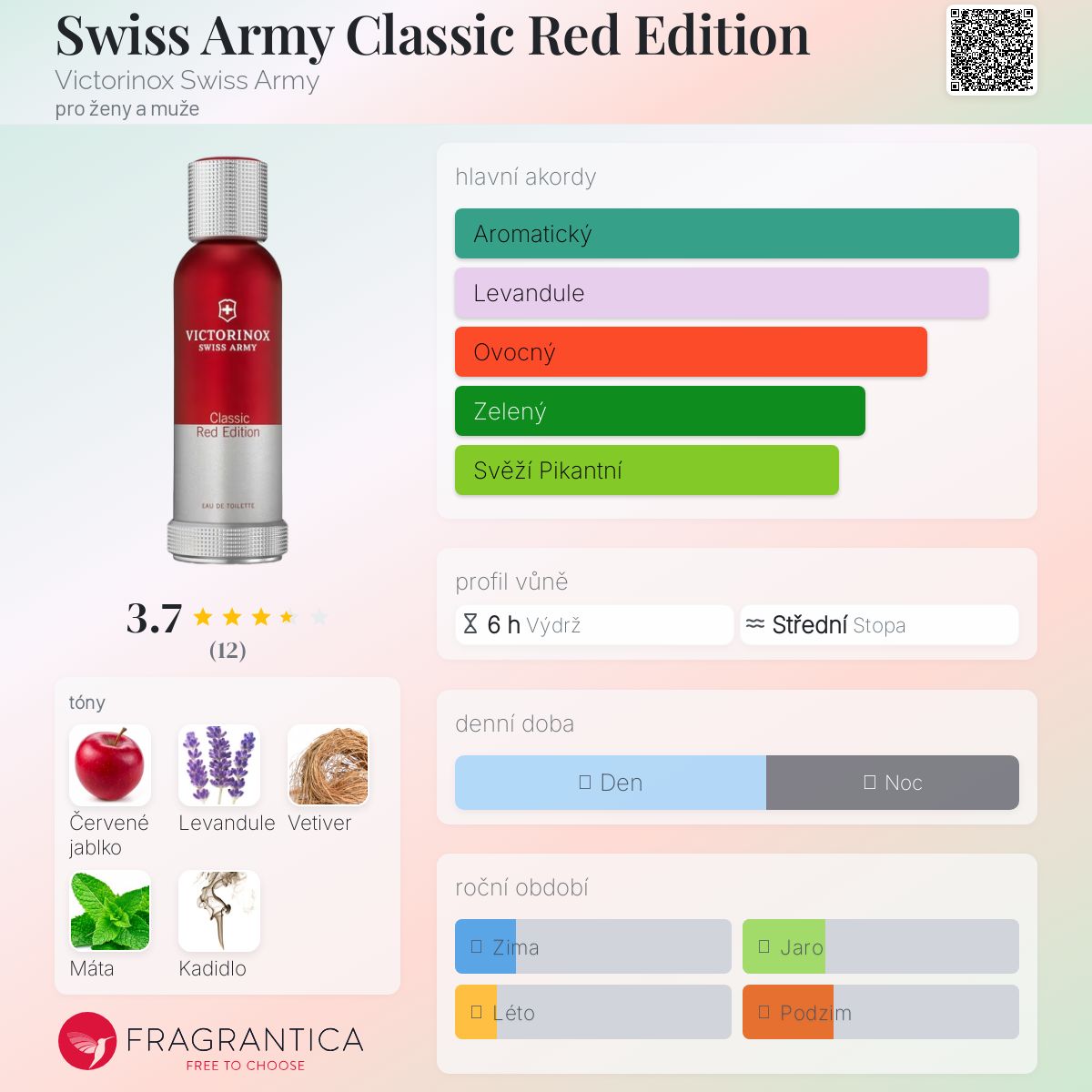 Swiss Army Classic Red Edition podle Victorinox Swiss Army je Woody Aromatic vůně pro ženy a muže. Swiss Army Classic Red Edition byl/a uveden/a v roce 2023. "Nosem" za touto vůní je Coralie Spicher. Vrchní tón je Červené jablko ; střední tóny jsouLevandule a Máta ; základní tóny jsou Vetiver a Kadidlo.
