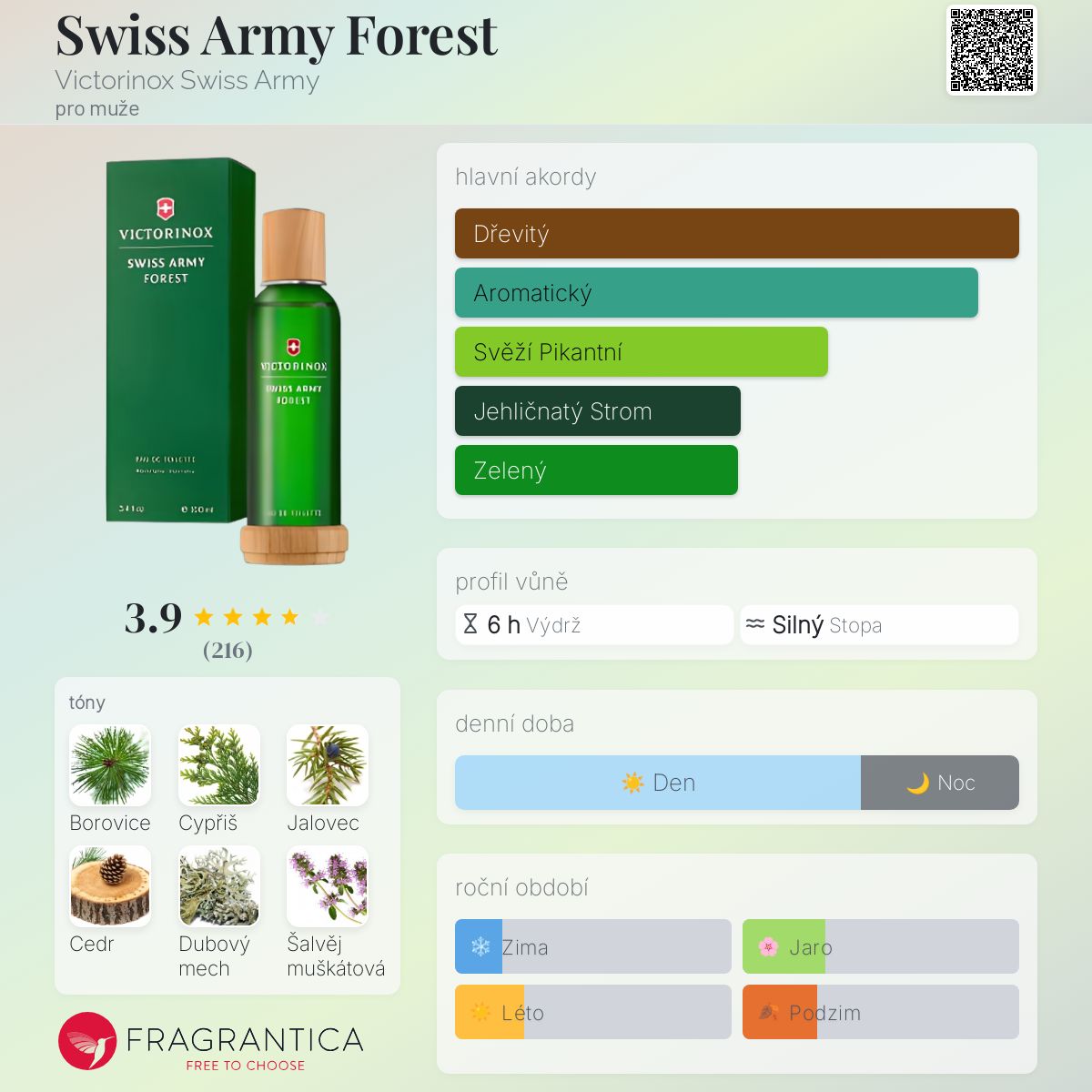 Swiss Army Forest podle Victorinox Swiss Army je Woody Aromatic vůně pro muže. Swiss Army Forest byla spuštěna během 2012. Swiss Army Forest byl/a vytvořen/a Fabrice Pellegrin a Jean-Pierre Bethouart. Vrchní tóny jsou Jalovec, Citrón a Muškátový oříšek; střední tóny jsouCedr, Šalvěj muškátová a Fialkový list ; základní tóny jsou Borovice, Cypřiš a Dubový mech.