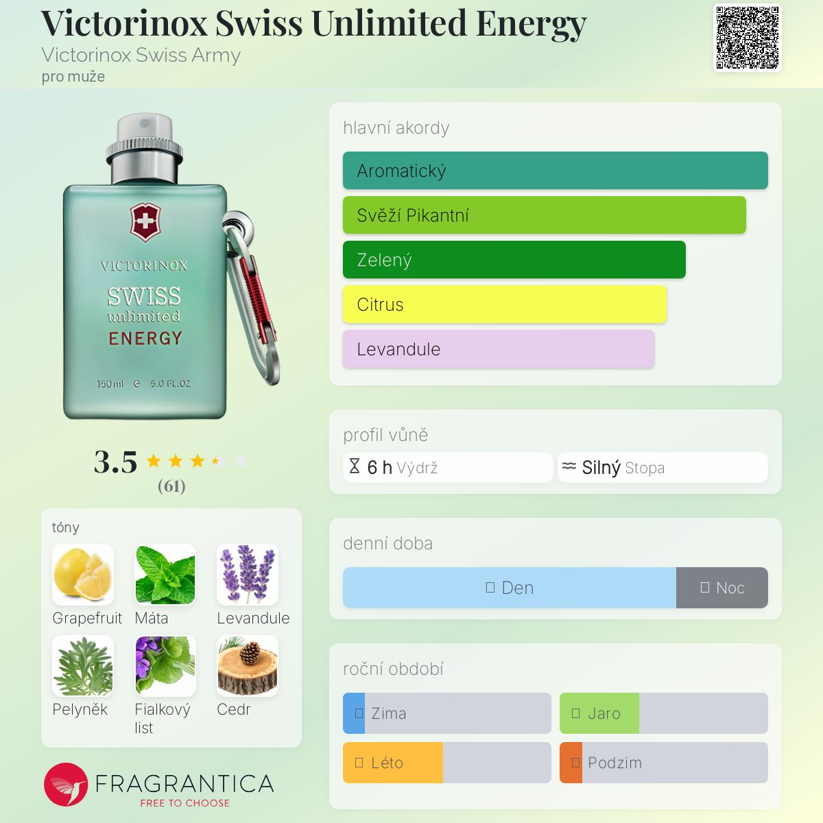 Victorinox Swiss Unlimited Energy podle Victorinox Swiss Army je Woody Aromatic vůně pro muže. Victorinox Swiss Unlimited Energy byl/a uveden/a v roce 2013. Vrchní tóny jsou Grapefruit, Máta a Fialkový list; střední tóny jsouLevandule, Pelyněk a Muškátový oříšek ; základní tóny jsou Cedr, Jantar (ambra) a Pižmo.