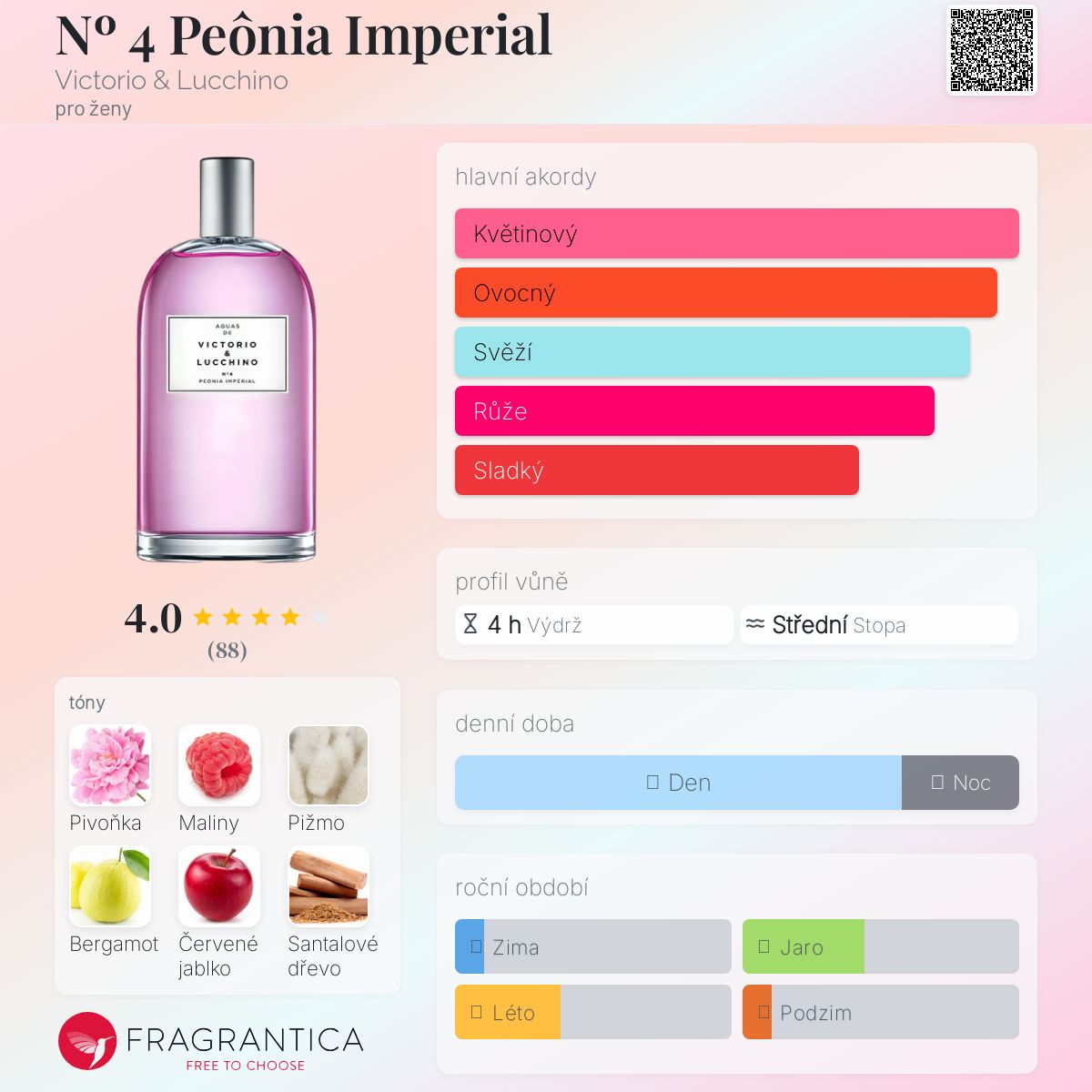 Nº 4 Peônia Imperial podle Victorio & Lucchino je Floral Fruity vůně pro ženy. Nº 4 Peônia Imperial byl/a uveden/a v roce 2016. Nº 4 Peônia Imperial byl/a vytvořen/a Gregorio Sola a Carine Boin. Vrchní tóny jsou Maliny, Bergamot, Červené jablko a Černý rybíz; střední tóny jsouPivoňka, Jasmín a Růže ; základní tóny jsou Pižmo, Santalové dřevo a Jantar (ambra).